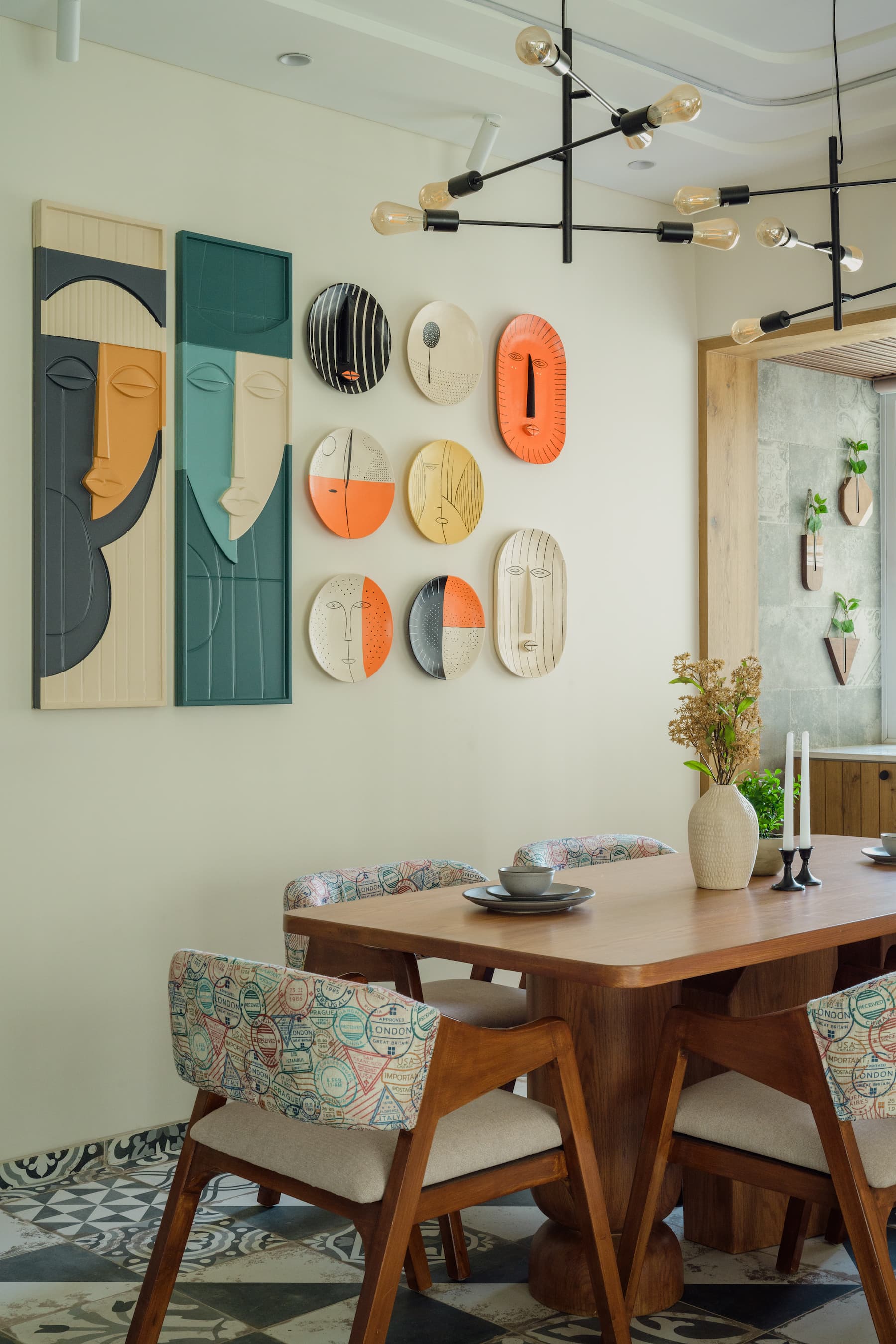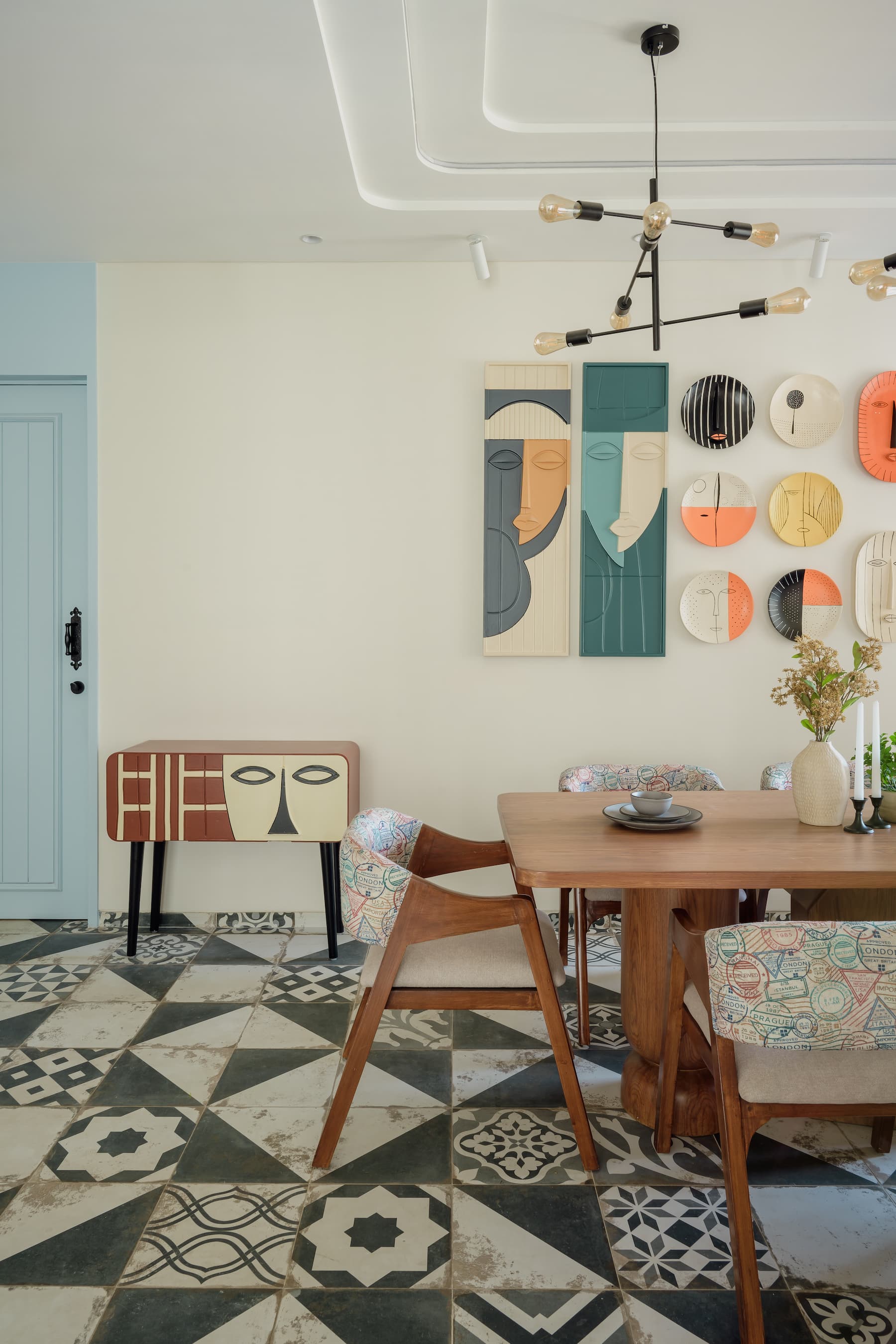 The dining area boasts a stepped ceiling design reminiscent of Art Deco style, underscoring the project’s dedication to period authenticity. The oak wood dining table, with its abstract solid wood legs, paired with light print fabric cushioned chairs, exudes elegance and comfort. Colourful, quirky artworks on the walls and a matching entrance console complete the dining area, ensuring that each element contributes to a cohesive and charming design narrative.