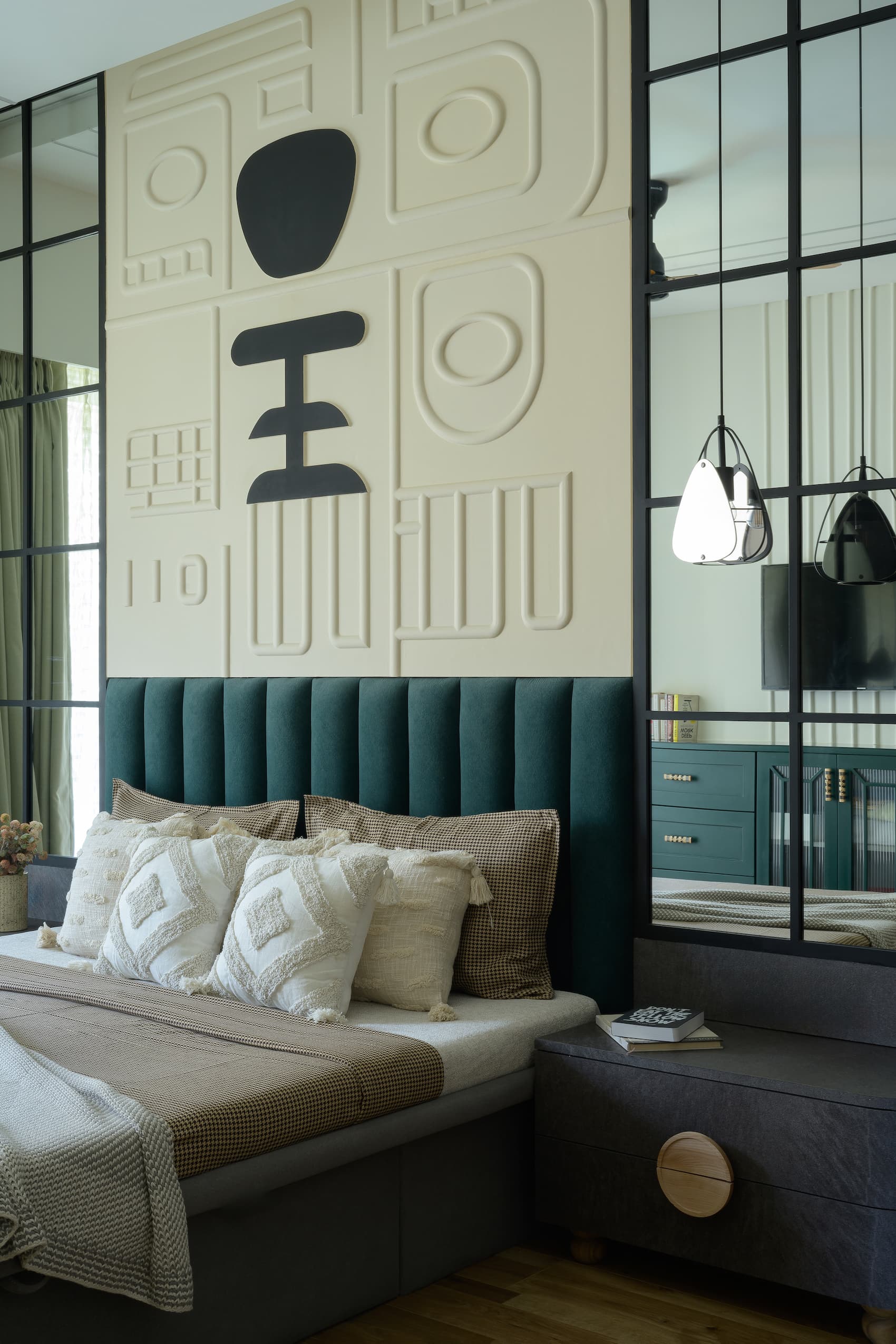 The master bedroom, a study in sophistication, showcases an emerald green headboard set against an abstract 3D art backdrop and framed by full-length mirrors arranged in a grid format. This dramatic focal point is complemented by an emerald green chest of drawers, doubling as a TV unit. Dark grey stone finish laminate and dark wooden flooring contribute to a serene, natural ambiance, blending modernity with a touch of tranquility.