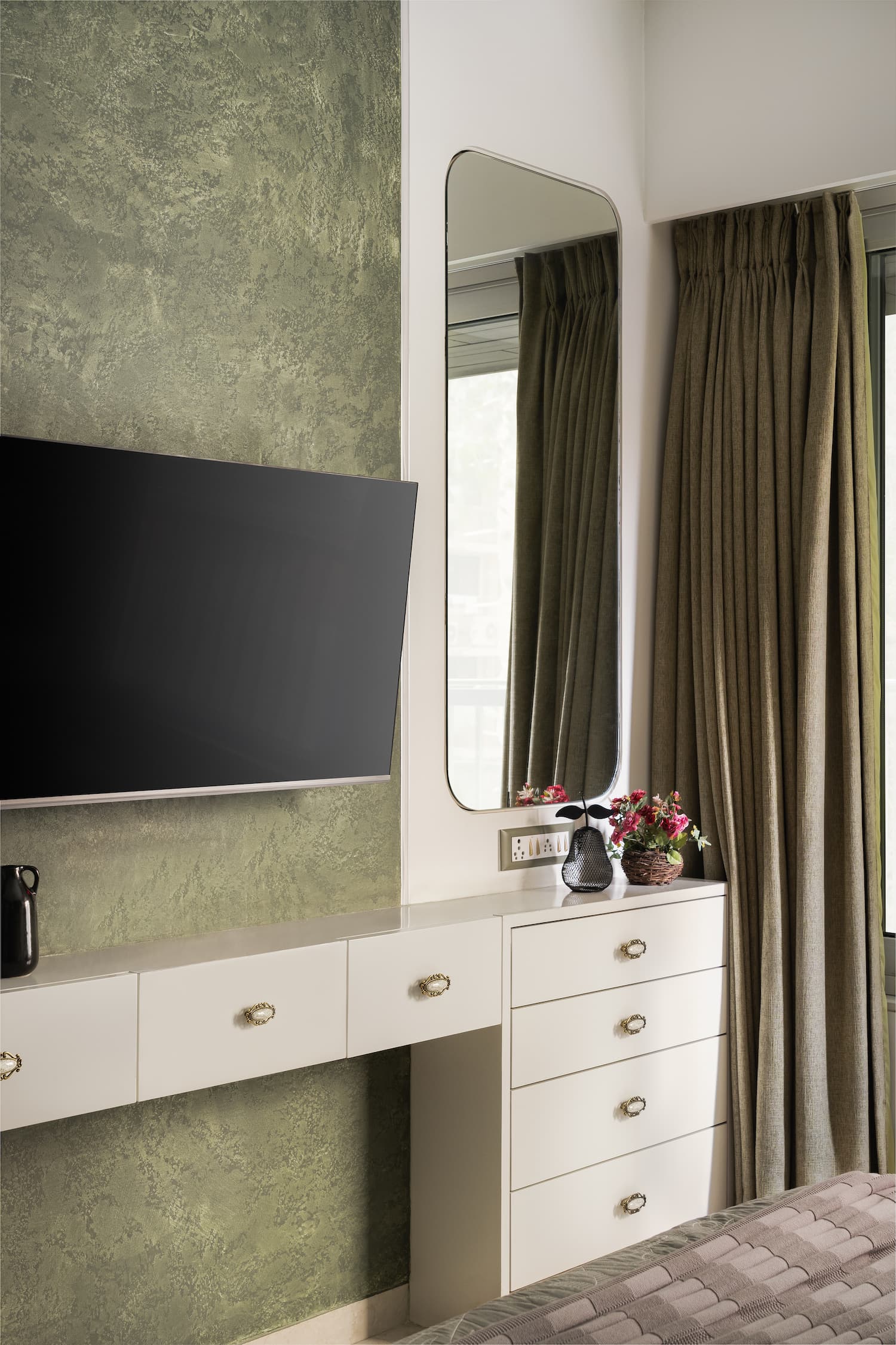 Every bedroom has been carefully planned, making sure each area blends harmoniously while still being individually tailored for each family member. Incorporating sharp lines and a palette of olive green and white, the young couple’s room exudes character and subtle elegance. An elaborate dressing unit and a small study table create a functional composition.