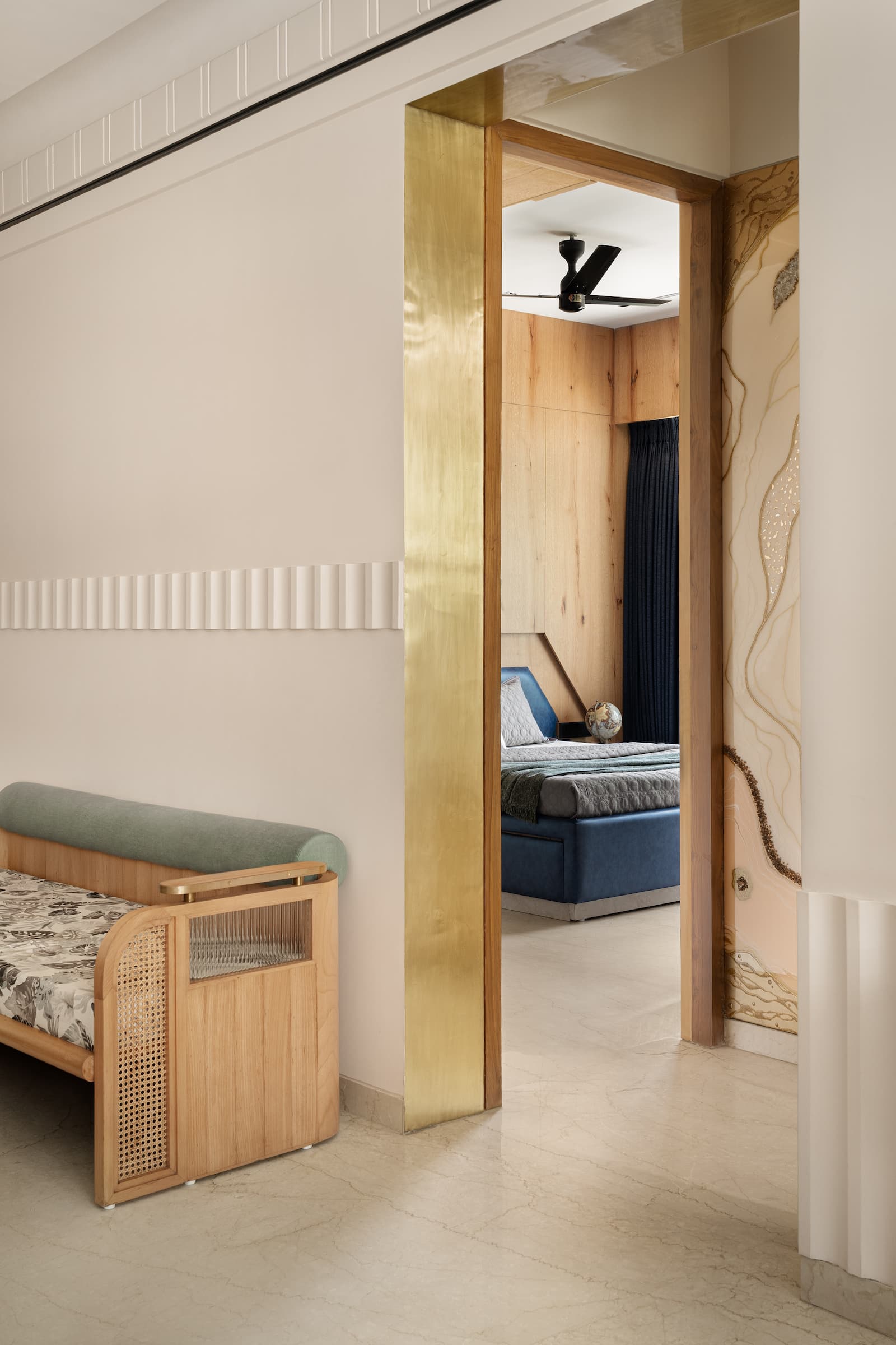 Bestowing a luxurious feel, the entrance features a grey marble-clad wall with a safety door adorned with geometric designs in circles and curves. Storage cabinets and a backlit name plate embedded in marble elevate the whole appeal. Designed to resemble an ivory canvas, the living room imparts a classical zen look. The elegant application of beige on the walls paired with oak wood furniture creates a calming atmosphere. A capsule fluted glass partition separates the dining area. Respecting the client’s Jain belief system, a mandir with ashthamangal on both sides with bells in alternate squares is incorporated. With meticulous attention to furniture details and material experimentation, the sofa, lounger chair, and centre table in the formal living area are designed by Soch Design Studio. A floor-standing swing and oak wood sofa bring functionality and style to the informal living room.