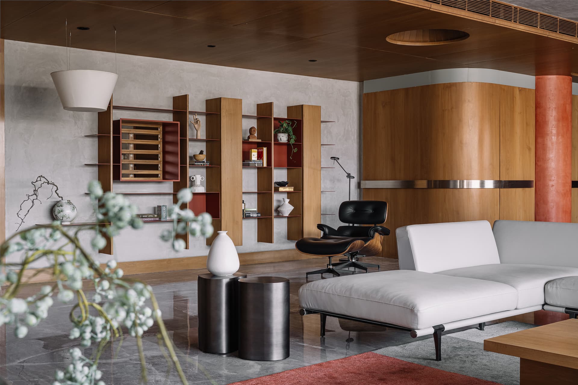 The living room is kept clean, minimal, and uncluttered. Simple furniture, including upholstered seating, stainless steel side tables and a solid wood coffee table, anchors the room with a balanced material composition. Pops of terracotta red colour are introduced strategically, to draw emphasis on geometric composition and bespoke elements. The open layout lends itself effortlessly to both daily living and hosting larger gatherings.