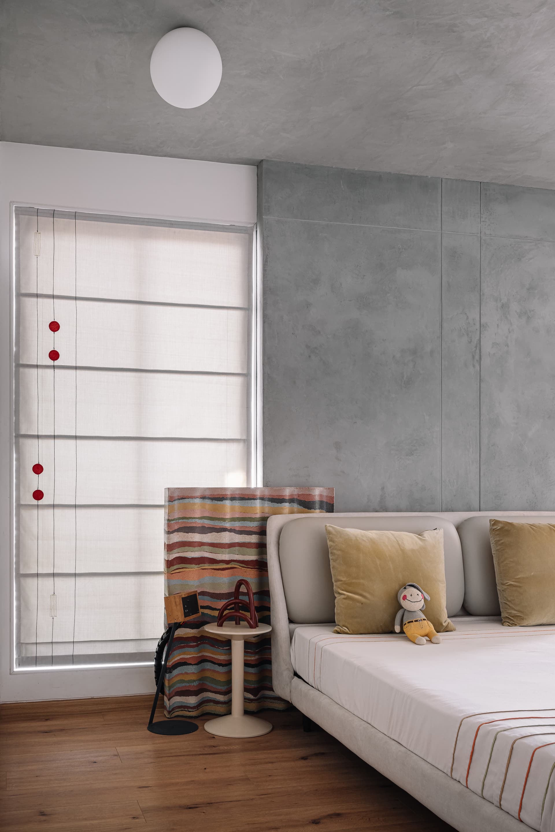 Continuing the home’s soft and grounded sensibility, the daughter’s bedroom features a simple upholstered bed that invites rest. A birch plywood wardrobe stained in tones of sea green, red, and yellow stretches across the wall like a painted landscape. The wood’s natural grain and texture remain visible beneath the stain, which is an intentional gesture reflecting the home’s honest and minimal approach to surfaces.