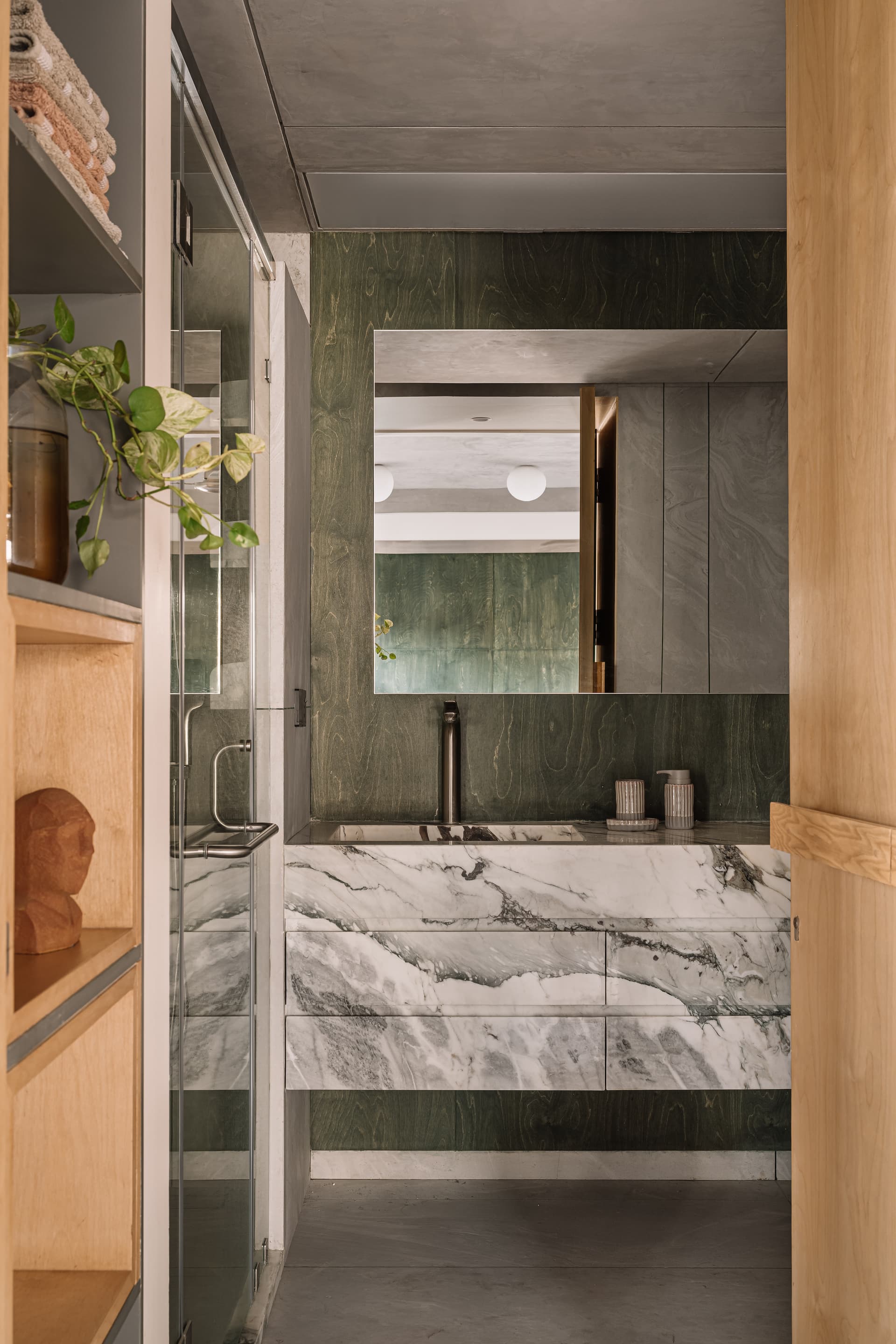 The kitchen features a layered material palette that creates visual depth and interest. A central stainless steel island reflects natural light, thereby helping it blend into the space. It is surrounded by a Kota flooring to protect against stains. Dark stone countertops, terracotta surfaces, and wooden cabinetry lend a sense of warmth and tactility, complementing the clean lines and restrained palette. A clear glass backsplash, fixed directly onto the plastered wall, remains nearly invisible until viewed up close. Nearby, a custom-made pigmented concrete basin enclosed within a curved stainless steel partition serves as a shared element between the kitchen and dining. Together, these elements embody a thoughtful interplay between opaque and transparent materials.