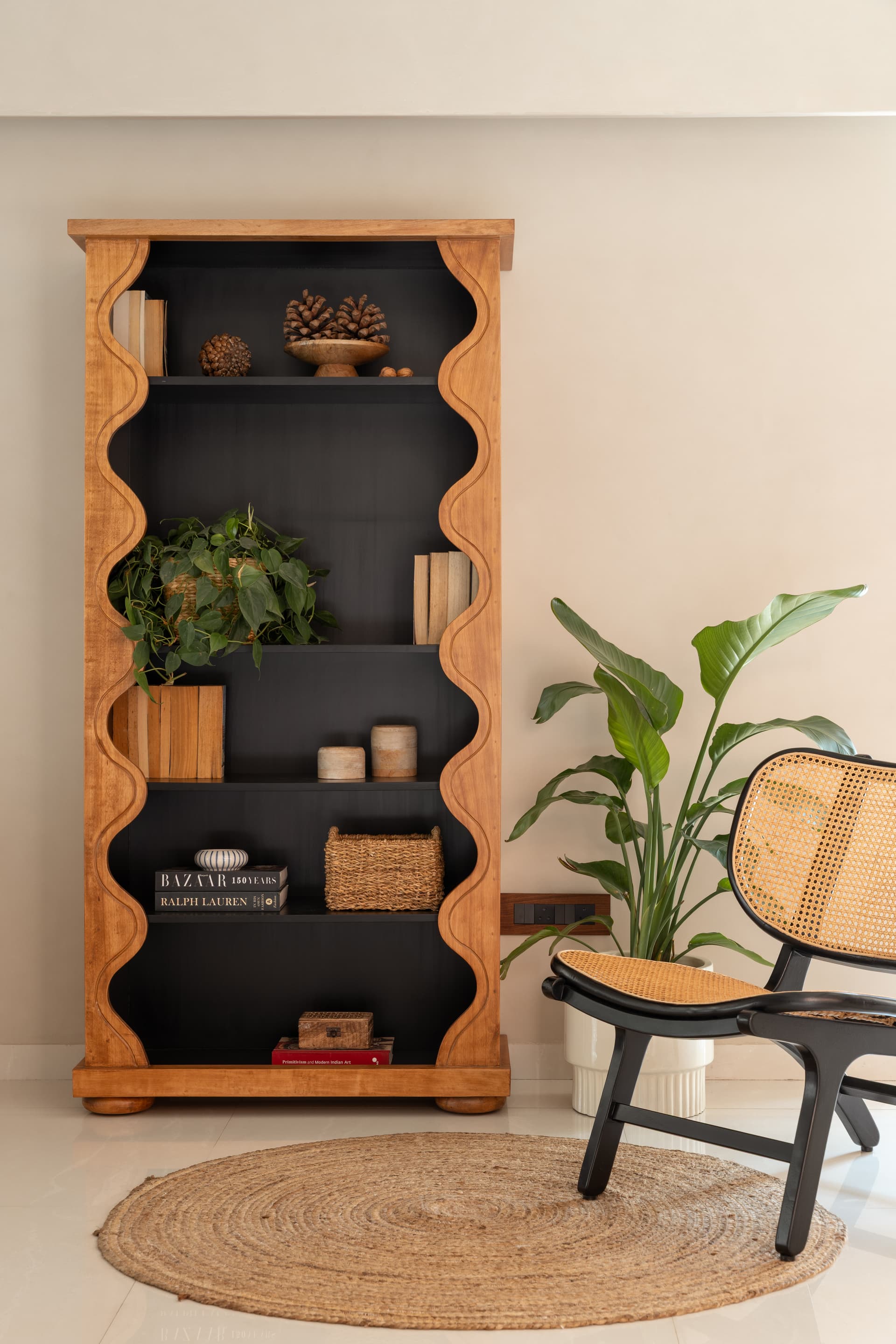 A scallop-edged timber bookshelf paired with a cane-and-black-lacquer lounge chair occupies a corner where the living area meets a circulation zone. The bookshelf’s playful silhouette introduces a note of personality, a gesture that suggests the home accommodates individual taste without losing its larger material coherence.