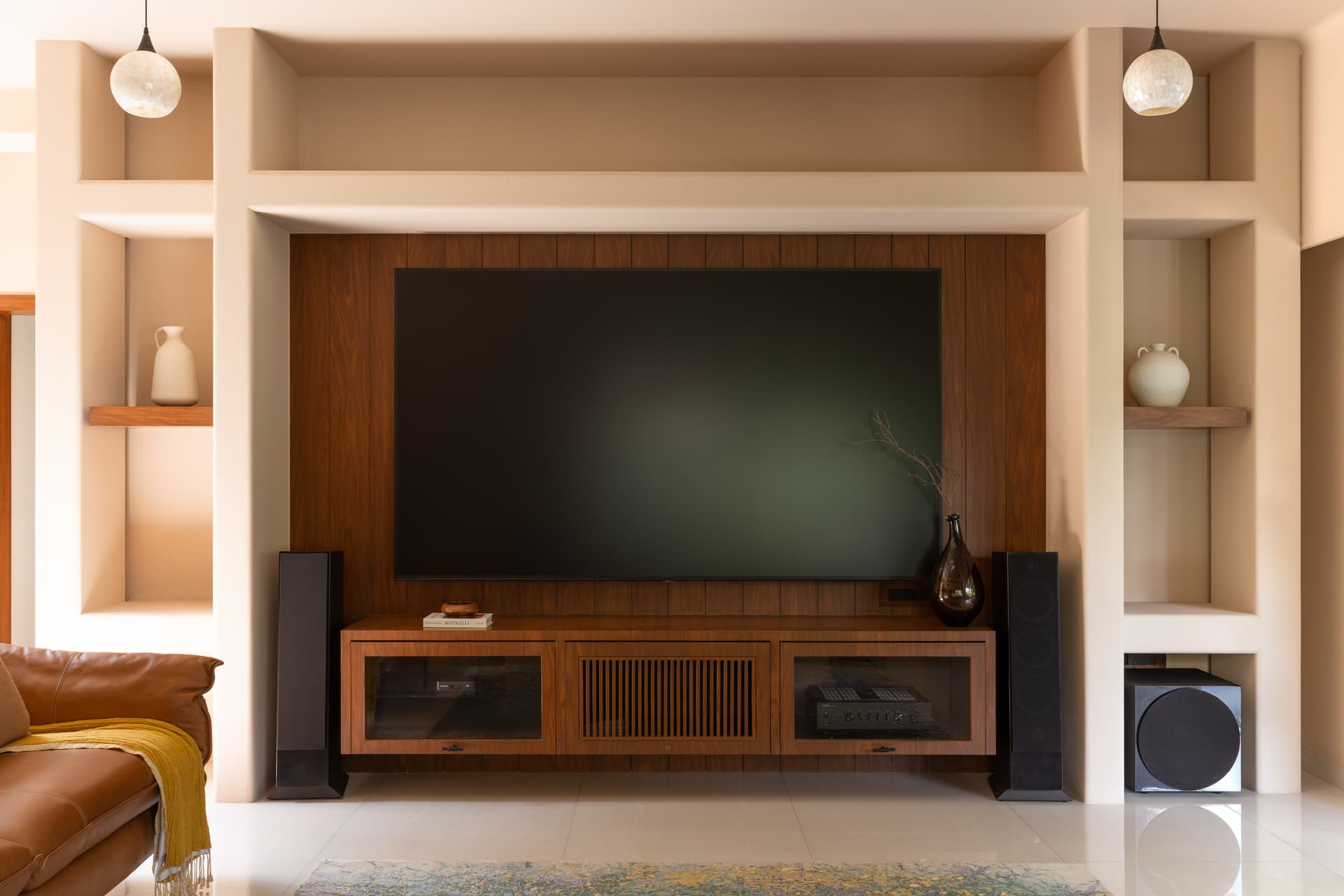 The entertainment wall resolves the perennial challenge of integrating a large screen into a considered interior. A built-in unit of niches and shelves in plaster frames a timber-backed alcove that houses the television, while the asymmetric shelving around it becomes display space. The unit reads as architecture rather than cabinetry.
