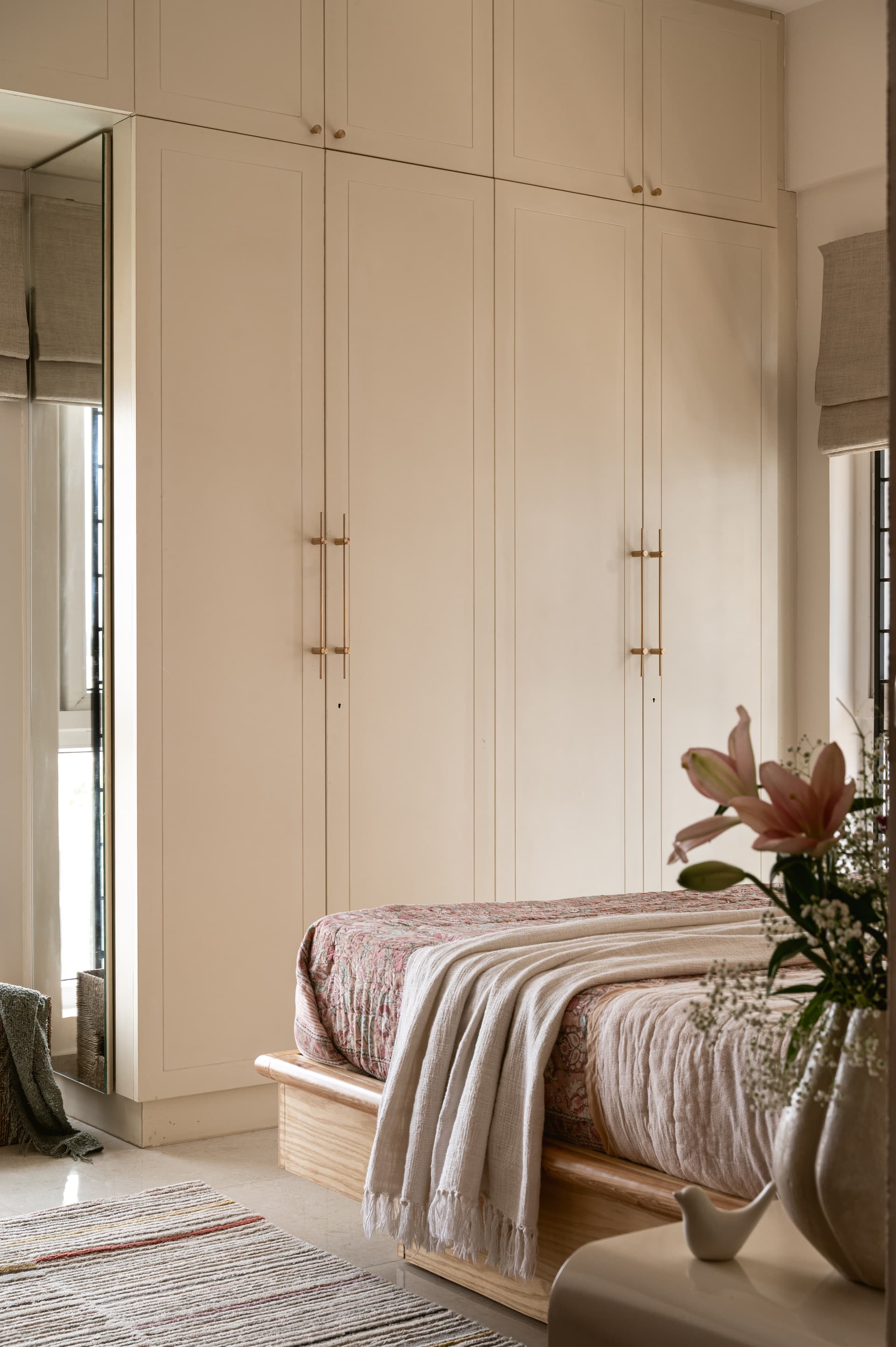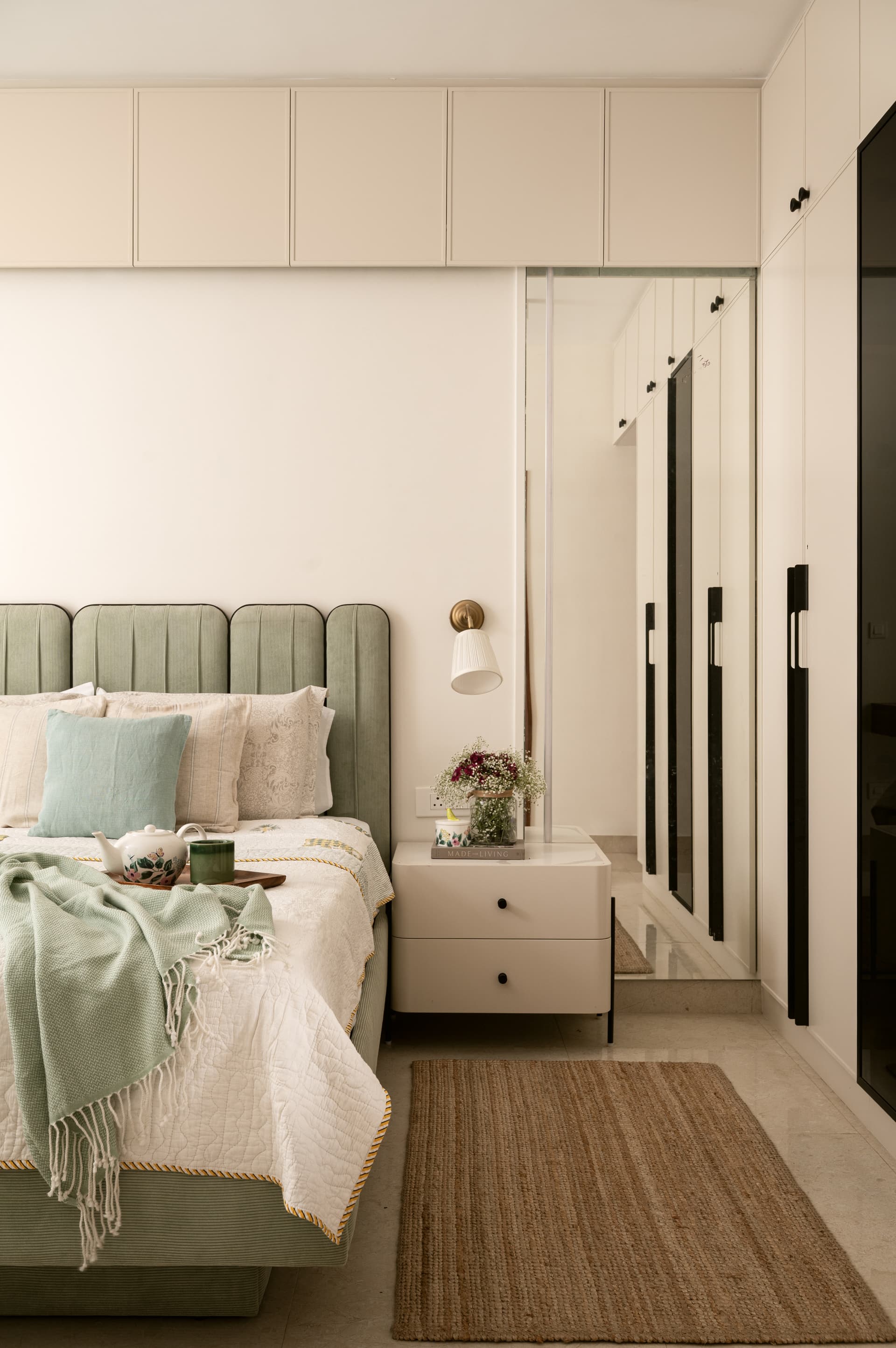 Each of the bedrooms follows a personalised approach to colour and mood. In one, an olive green headboard brings a sense of freshness, while another features a rust-toned backdrop that adds warmth and energy. Importantly, all bursts of colour are confined to loose furniture and furnishings, making future updates easy and cost-efficient. Custom side tables and a minimalist chest of drawers extend the home’s cohesive design language, enhancing both form and function.