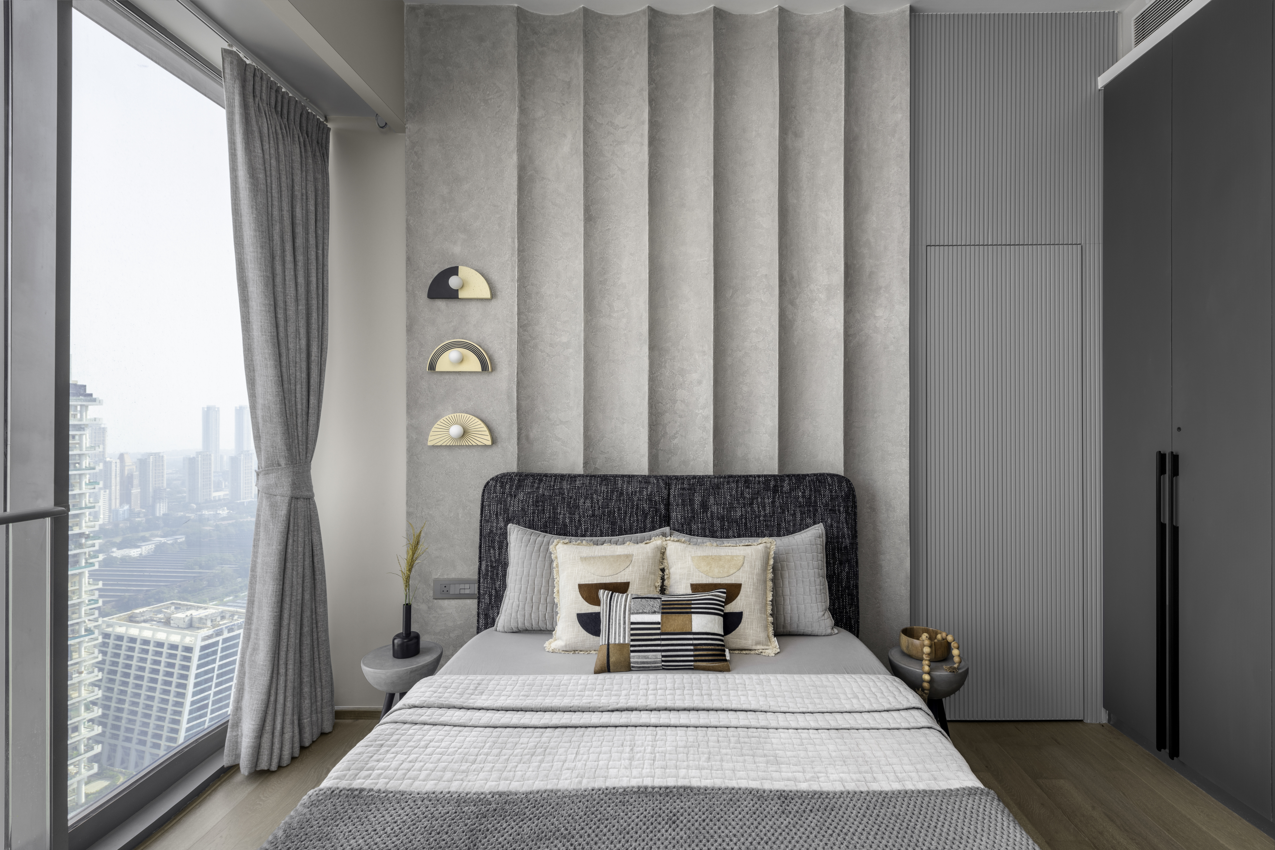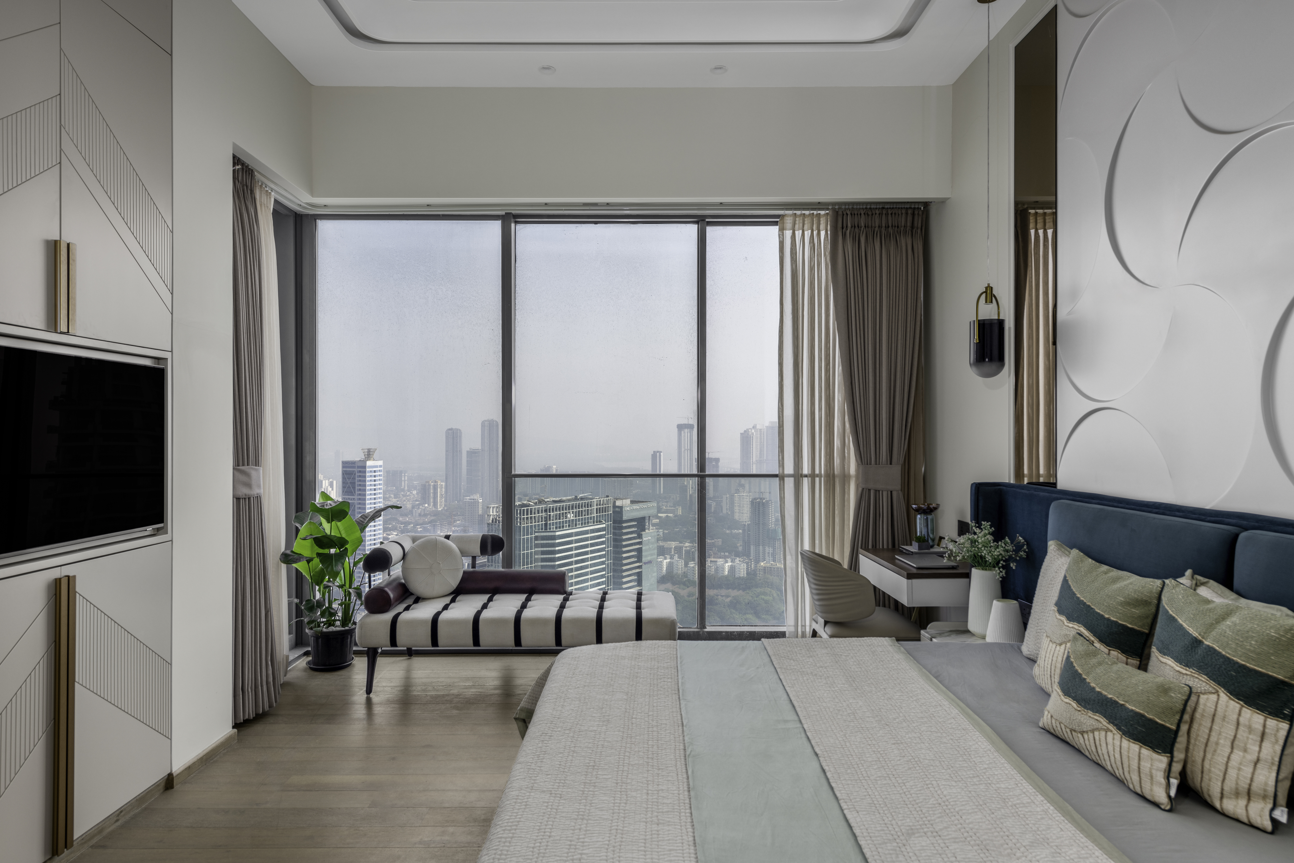 The master bedroom distills the essence of calm. Muted tones reminiscent of dawn’s first light meet sea-inspired blues in the upholstery, while a window-side bench invites pause. A cleverly integrated swivel TV unit merges seamlessly into the wardrobe, keeping the visual flow uninterrupted.