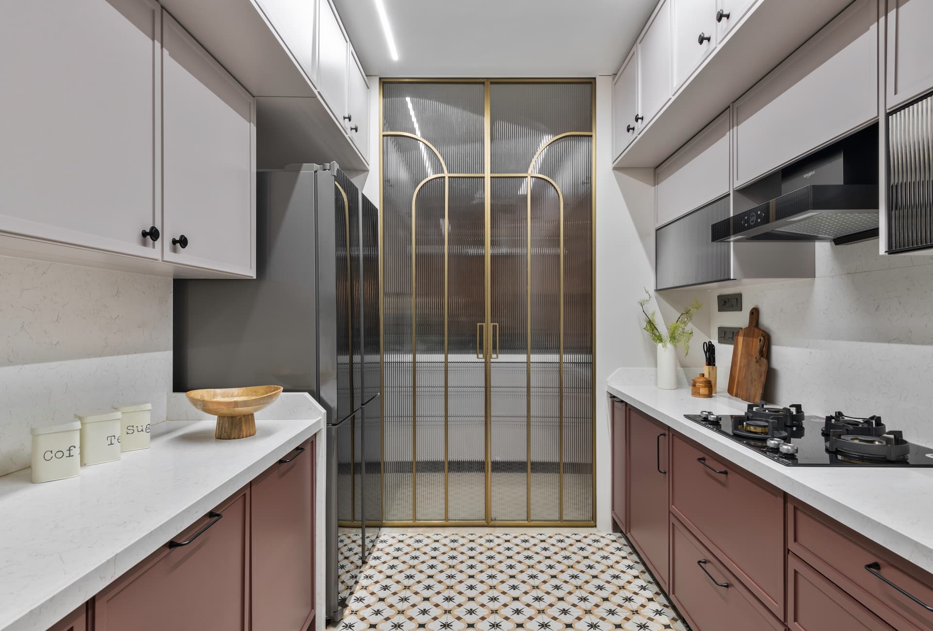 Just beyond, the kitchen introduces a playful counterpoint. The breakfast counter, dressed in exotic Amazon Green marble, conceals a bold surprise: rust-red cabinetry paired with white Caesarstone countertops and patterned Spanish tiles. The automated frosted glass panel, framed in brass, ensures the space transitions fluidly between open and private, social and silent.