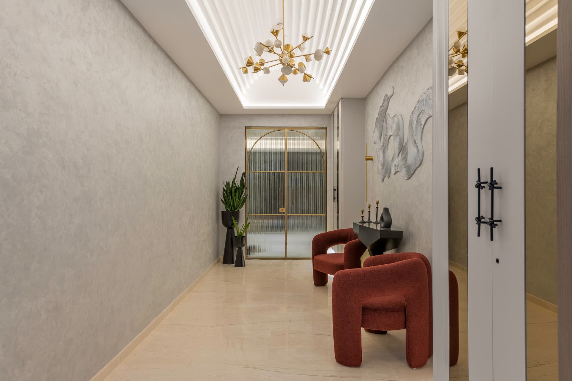 The experience begins with drama, a 20-foot-long entryway where a sculptural chandelier hovers above bold crimson seating and abstract planters. The play of colour and texture establishes rhythm before the home unfolds into two distinct wings: one leading to the master suite and study, the other to the parents’ and guest bedrooms. At the heart, the living, dining, and breakfast zones flow seamlessly, united by a concealed kitchen tucked behind a frosted glass panel that slides away to open up the space when desired.