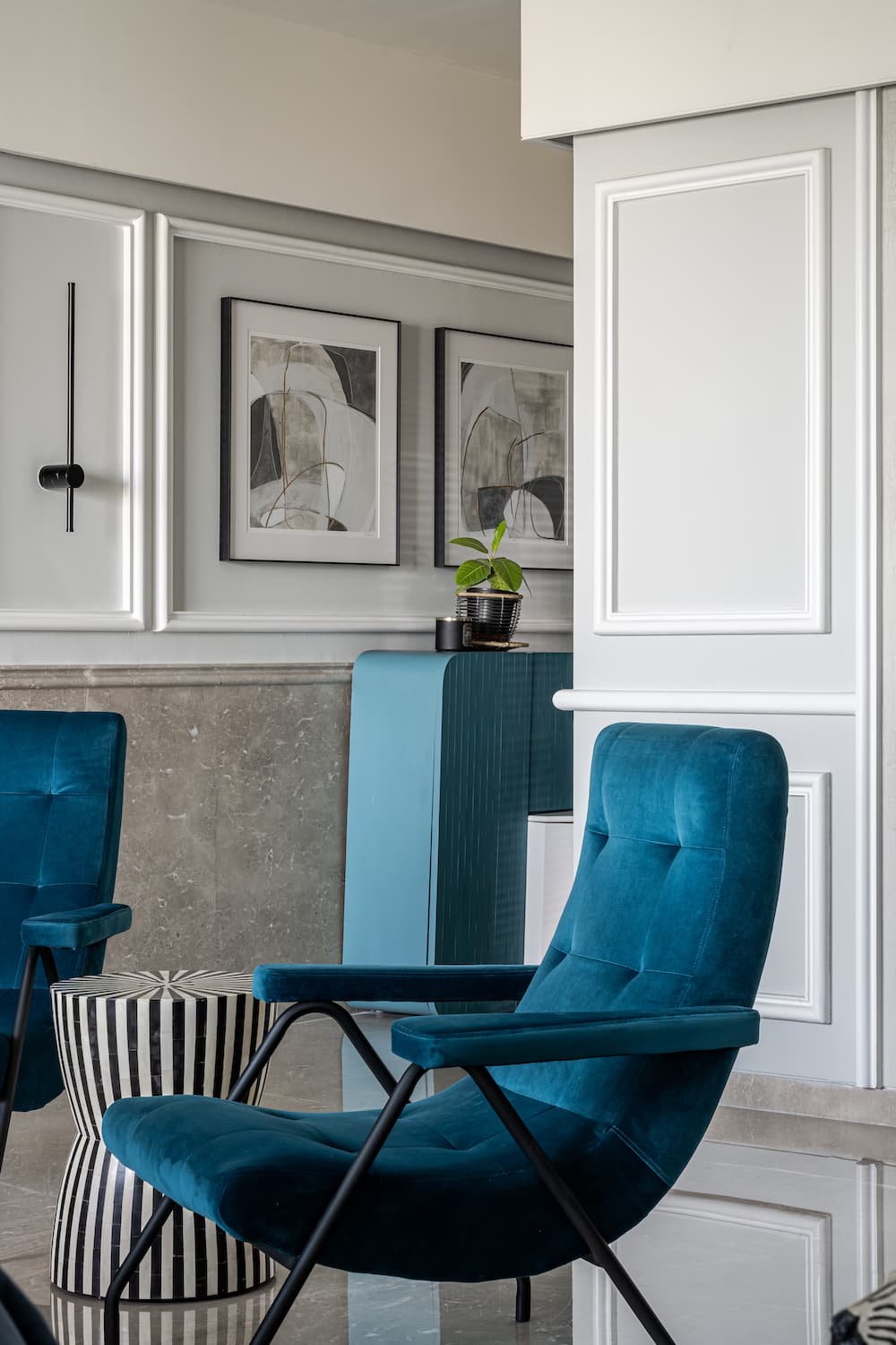 The dining area forms a beautiful cluster of furniture, each playing their part functionally & aesthetically – a stone top round table accompanied by lush dining chairs. As a backdrop stands a tall blue crockery/bar unit with a stone-top surface to work on, glass cabinets and an intricate crowning on top– becoming the focal point of the space. All furniture pieces are crafted and curated with attention to the most minute detail, from their colours to their forms to compliment the space they reside within.