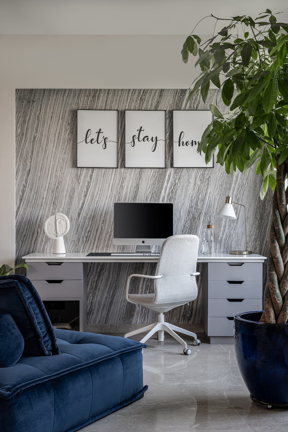 The tranquil yet stylish study space in this residence consists of a stone-top desk, placed against a stone-studded wall. As an extension to this, there is a comfy window alcove and a seating in the centre of the space where the residents can read or simply relax.
