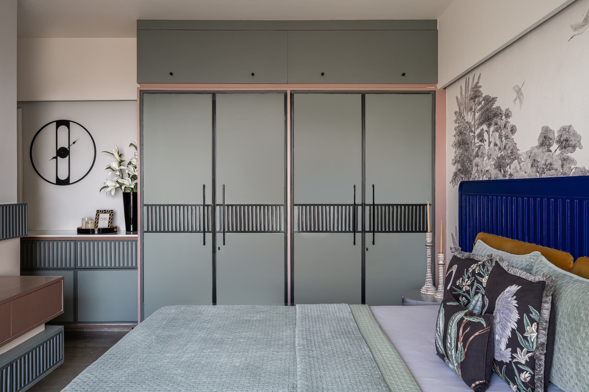 The master bedroom narrates a statement of style with blues and flutes, following the predefined language of this whole project. Compact in character this room is strategized with cohesive materials and colours. The quirky blue bed back has an interesting impact on the eyes, set against a graceful tropical wallpaper finished with accent wall sconces. The room receives a soothing amount of daylight, keeping the space bright & lively throughout the day. The muted green wardrobe has flutings in the middle to break the solidness of the surface and add a linearity to it. The whitewashed ceiling and pale dyed curtains make the room look larger spatially.