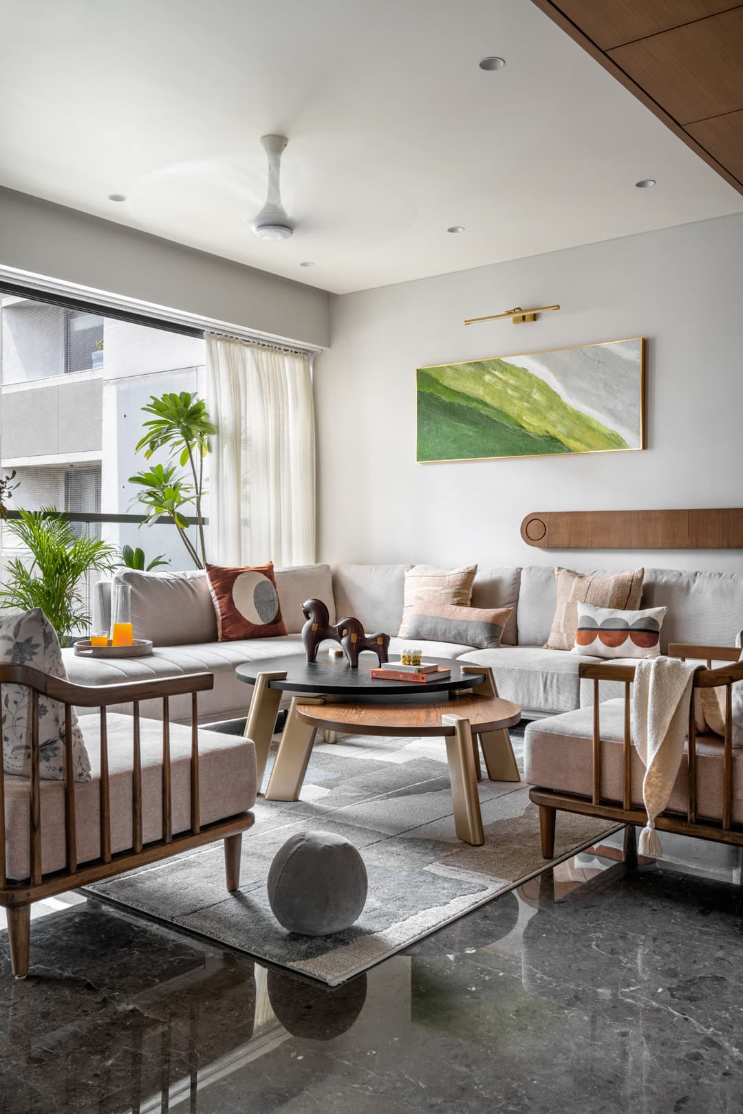 In the bustling city of Ahmedabad, where tradition gracefully intertwines with modernity, lies a 2000 sq. ft., 4 BHK luxury apartment designed to cater to the unique tastes of a multigenerational family. This exquisite project by Devanshi Doshi and Shivam Vaidya of Studio Deshi, aptly named ‘Whispers of Elegance,’ blends distinct design aesthetics of different generations within a minimalist framework.