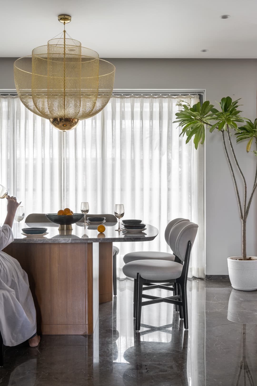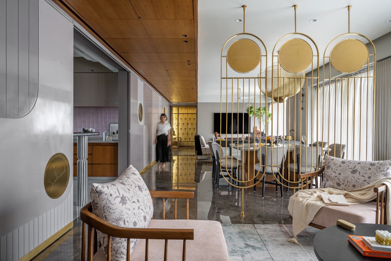 The long, linear central space of the apartment is ingeniously divided into two living areas and a dining area, creating a dynamic flow that connects perpendicularly with the kitchen. This layout allows for the spaces to adapt and transform according to the family’s needs, whether for intimate family gatherings or larger social events. The custom brass screen that divides the formal living and dining area adds a touch of elegance while maintaining a sense of openness and connectivity. The dining table, strategically placed at the centre of the home, serves as the heart of the house. It is complemented by a beautiful mesh brass chandelier, which acts as a focal point and enhances the space’s luxurious ambience.