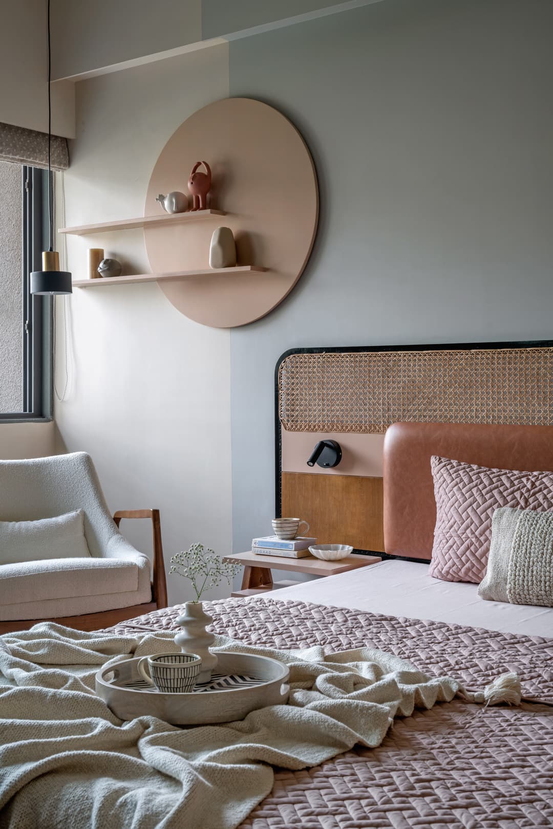 The daughter’s room embraces Indian contemporary aesthetics with a Bohemian touch, creating a playful and vibrant environment. The use of cane with teak wood gives the room a distinct personality, while tones of peach and curved design elements add a feminine and softer touch. This space is designed to be a haven of creativity and comfort, reflecting the daughter’s unique style and preferences.