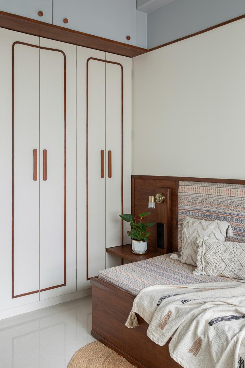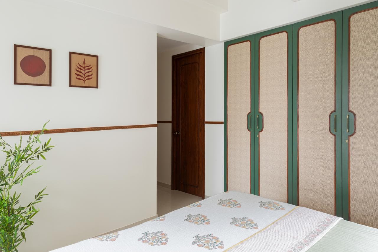 Each bedroom in Ulka unfolds as an expression of individuality. The master bedroom exudes quiet grandeur with its forest-green palette and upholstered headboard framed by delicate columns, a nod to traditional Indian design reinterpreted through a refined, modern lens.