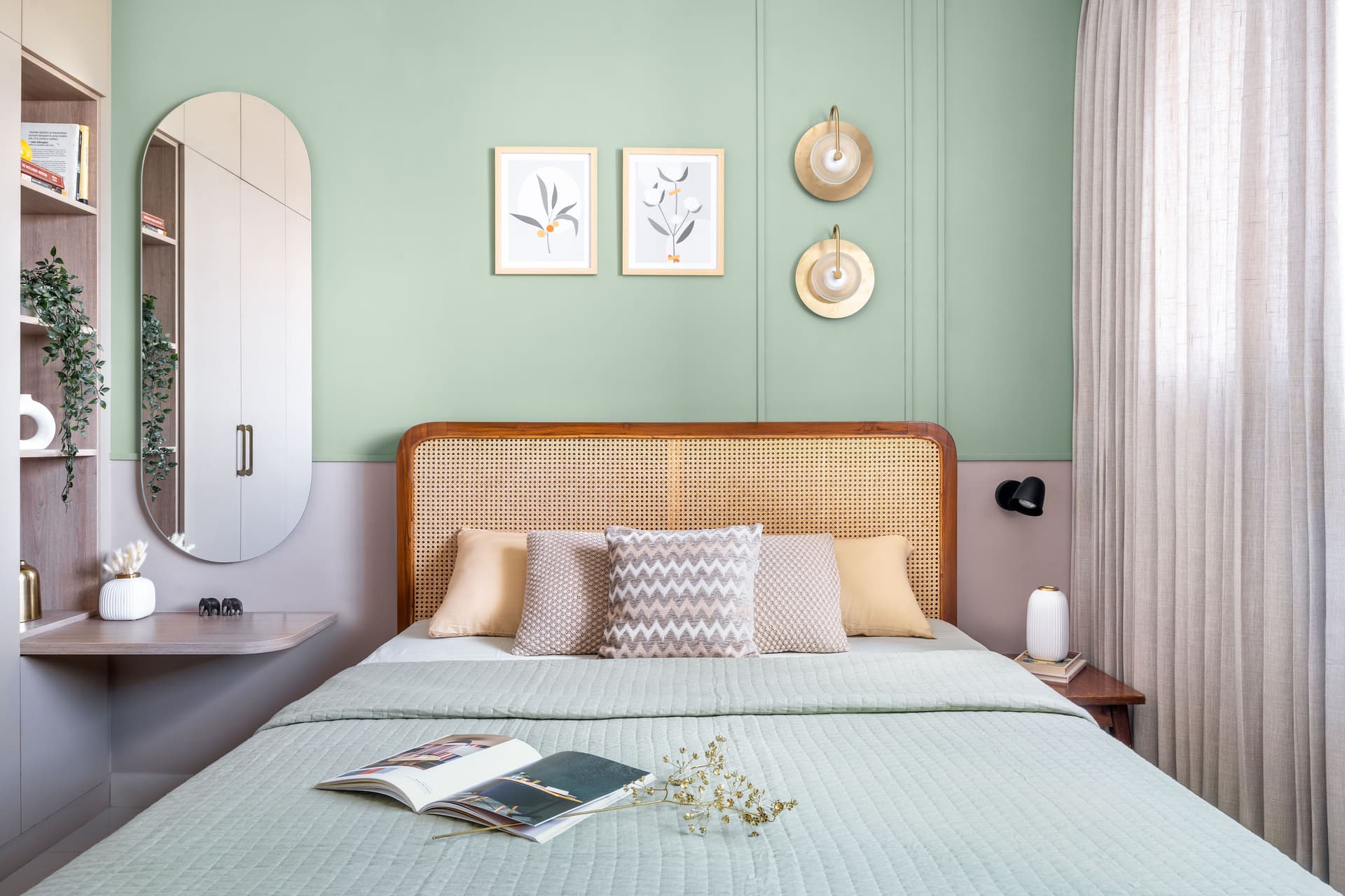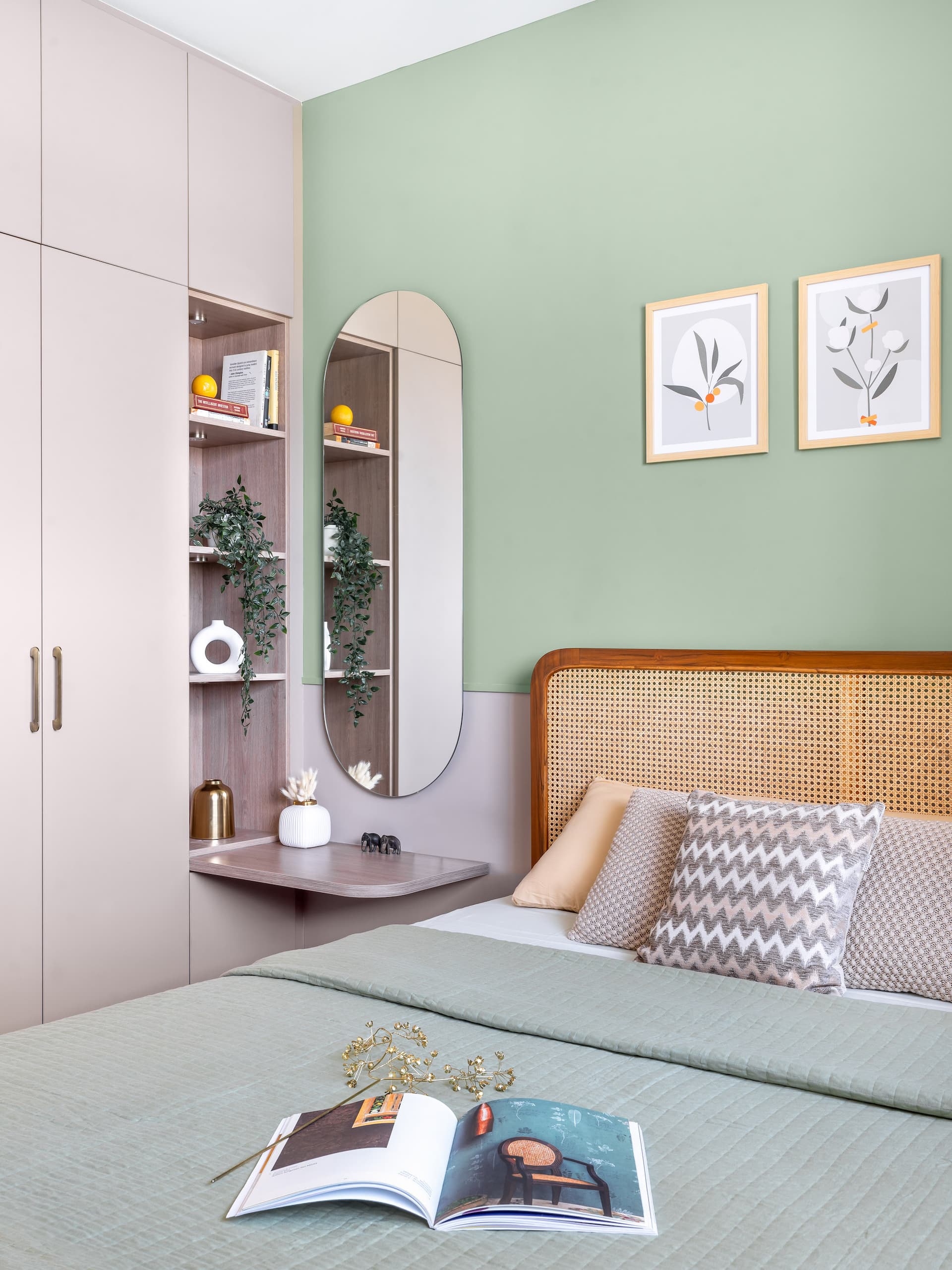 The bedroom exudes tranquility, enveloped in a soft mint green and blush colour scheme. A cane headboard adds texture and warmth, while built-in storage solutions maximise space efficiency without compromising on style. The arched mirror and wall sconces create visual intrigue, turning the bedroom into a serene retreat.