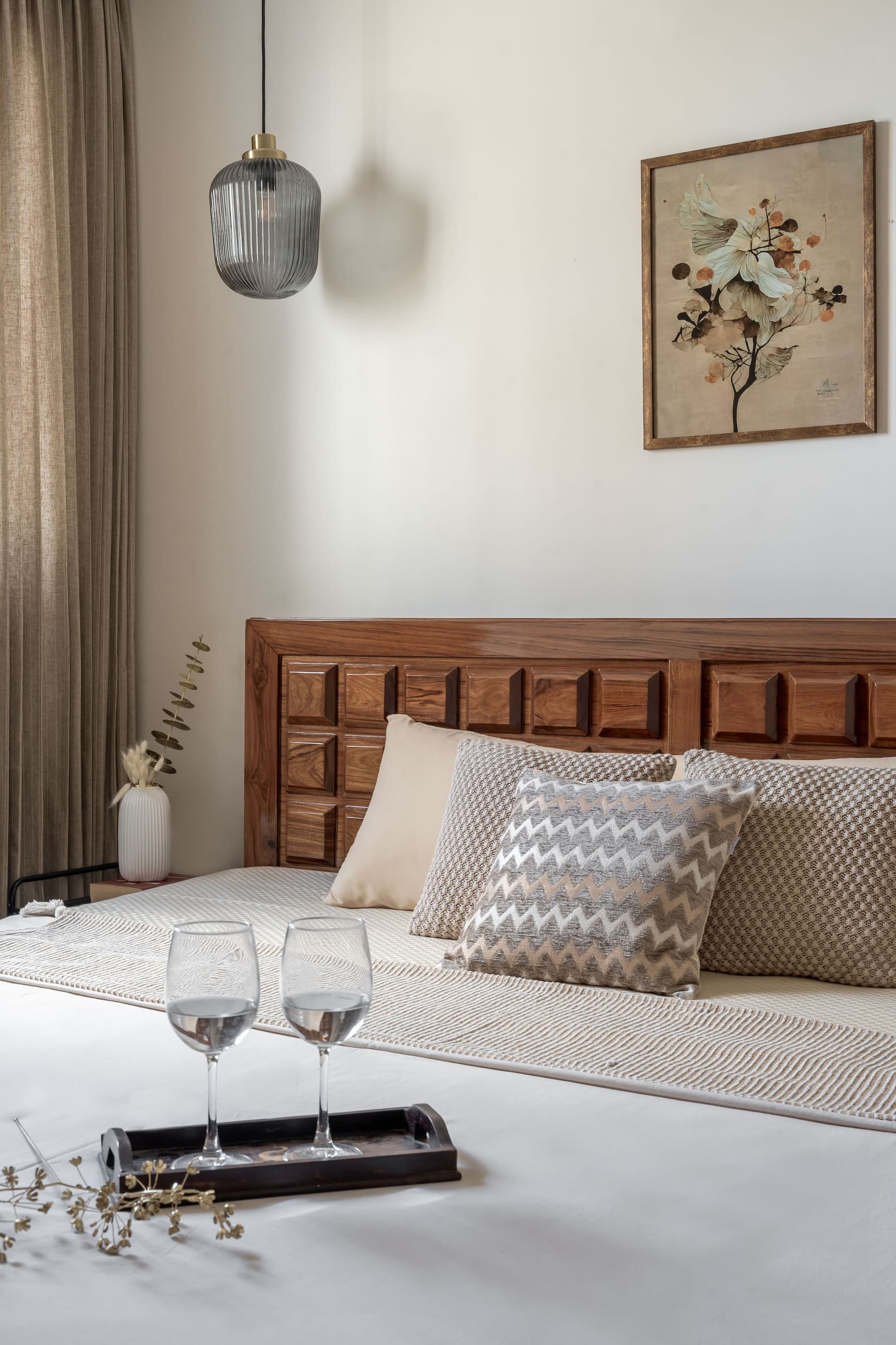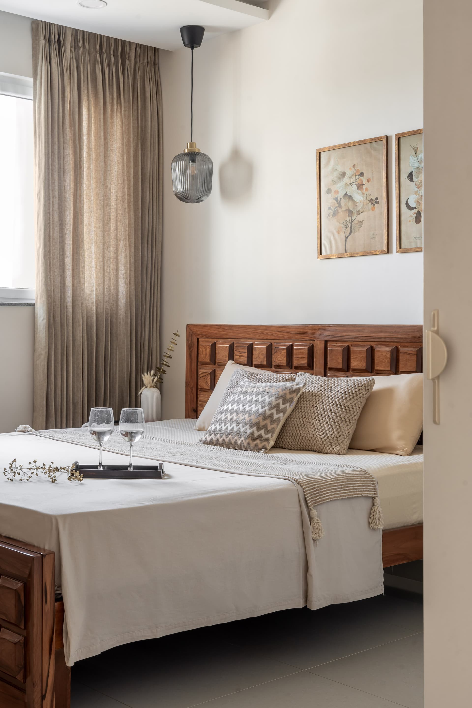 In the other bedroom, a warm, muted palette creates a serene and understated ambiance, perfectly suited for relaxation and focus. The design embraces minimalism, allowing the natural beauty of the materials to take centre stage. A wooden bed, with its clean lines and rich grain, serves as the focal point of the room, exuding a sense of timeless elegance. Complementing the bed is the wooden study table, designed to provide a functional workspace without disrupting the room’s calm atmosphere. The simplicity of the design, combined with the warmth of the wood, creates a space that feels both inviting and tranquil, offering a perfect retreat from the bustle of daily life.