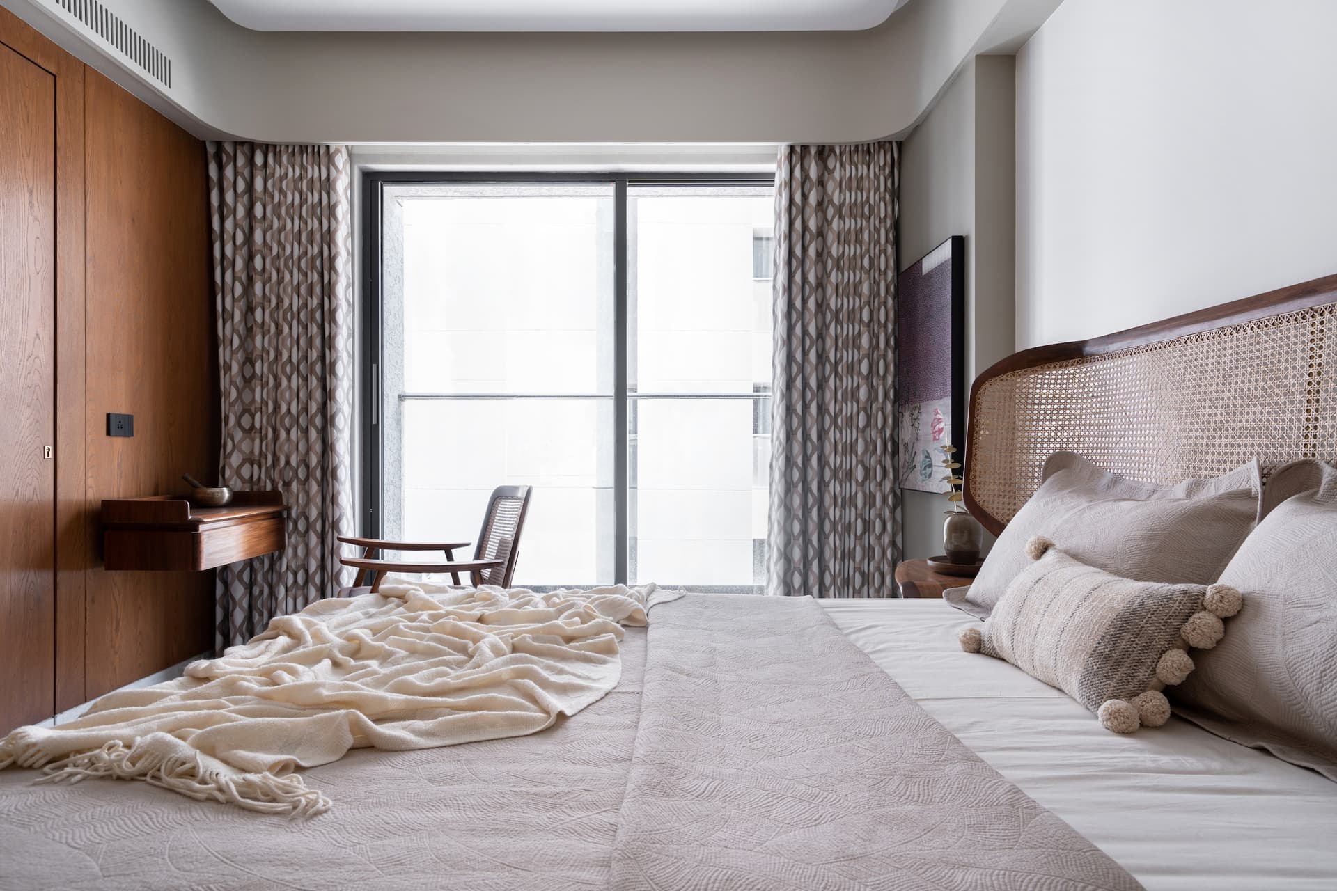 To further elevate the bedroom’s functionality and aesthetics, the design introduced an ergonomic yet sleek console table, featuring a curved solid teak wood edge, seamlessly supported by the wall. The design philosophy revolves around the celebration of materials in their truest form while preserving functionality and aesthetics. This integration is a true testament to the commitment to crafting spaces that are not just beautiful but also deeply enriching.