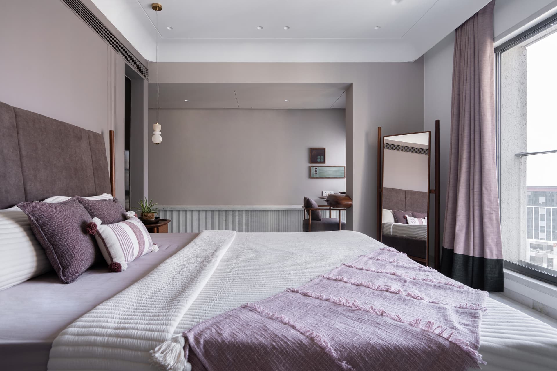 Unraveling the elder son’s Victorian bedroom, the space is consciously immersed in an idyllic energy that resonates with a serene and perfectly balanced blend of elegance and functionality, all enveloped in the soothing aura of lavender. This harmonious equilibrium extends throughout the room, as a beautiful and seamless interplay of wood and hues of lavender articulates a pleasant essence through its finest choice of material finishes. The meticulous fusion of intricate materials, subtle textures, and the gentle palette creates a charming and characterful environment, authentically reflecting the distinctive zen aura of the young occupant. The embodiment of this spirit extends to the sleek study design within the room. From the crisp bed back, which serves as a focal point of tranquility, to the fine furnishings that adorn the space, and the tailored furniture pieces that offer both form and function, each element has been thoughtfully integrated, bringing forth its true essence. The result is a bedroom that not only encapsulates beauty but also provides a space that resonates with the unique personality and energy of the son, creating a serene and harmonious sanctuary.