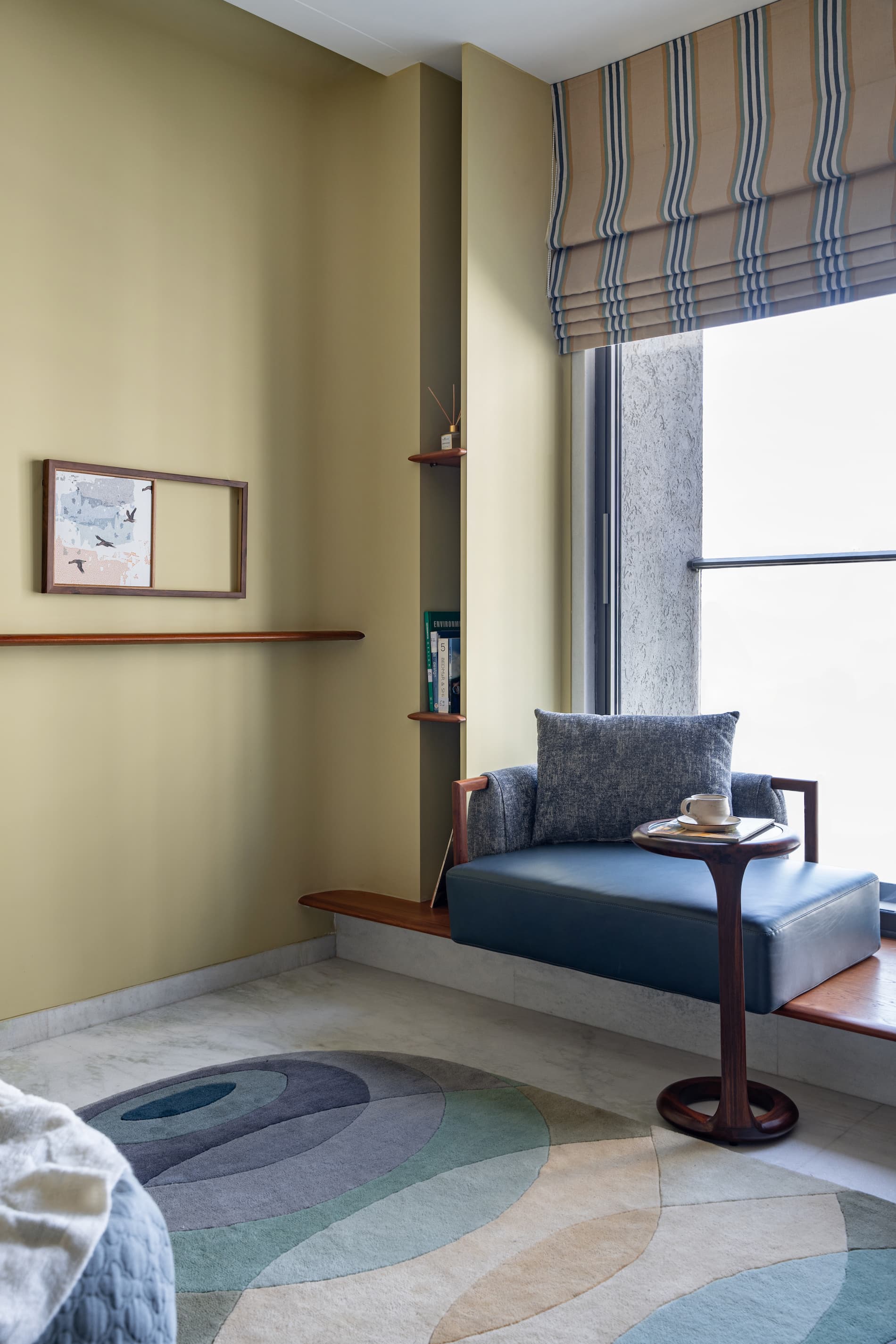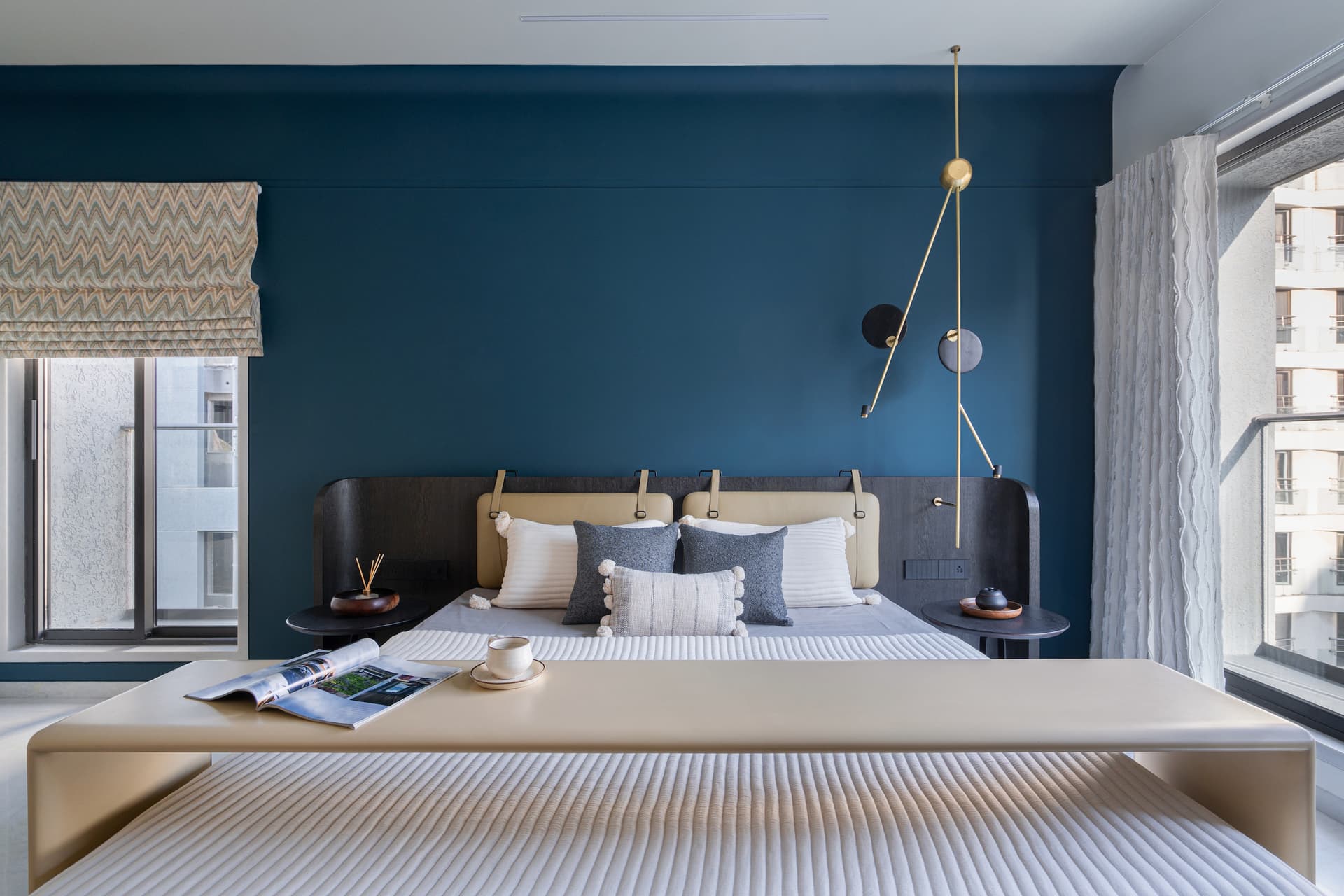 Stepping into the younger son’s bedroom, the foundation of the space design lies in weaving the design with a blue palette, where hues of neutral and black come together to create a serene and understated backdrop, evoking a sense of enduring refinement. A calm oasis of skillfully curated tones whispers minimalism with sharp design sensibilities. The bed back, an artistic tailored canvas, captures the spotlight, emphasized by the subtle play of customized lighting, effortlessly transforming the space into a cozy haven. To introduce a youthful element, the correlativeness of the space is skillfully contrasted by a distinctive and crisp study design, adding depth to the bedroom décor. In response to the post-COVID work-from-home trend, this bedroom incorporates a study design that prioritizes comfort and serenity for extended remote work hours. From the clean ceiling to the soothing furnishings, the futuristic design perfectly mirrors the client’s vision of creating a bold yet soothing retreat for the son.