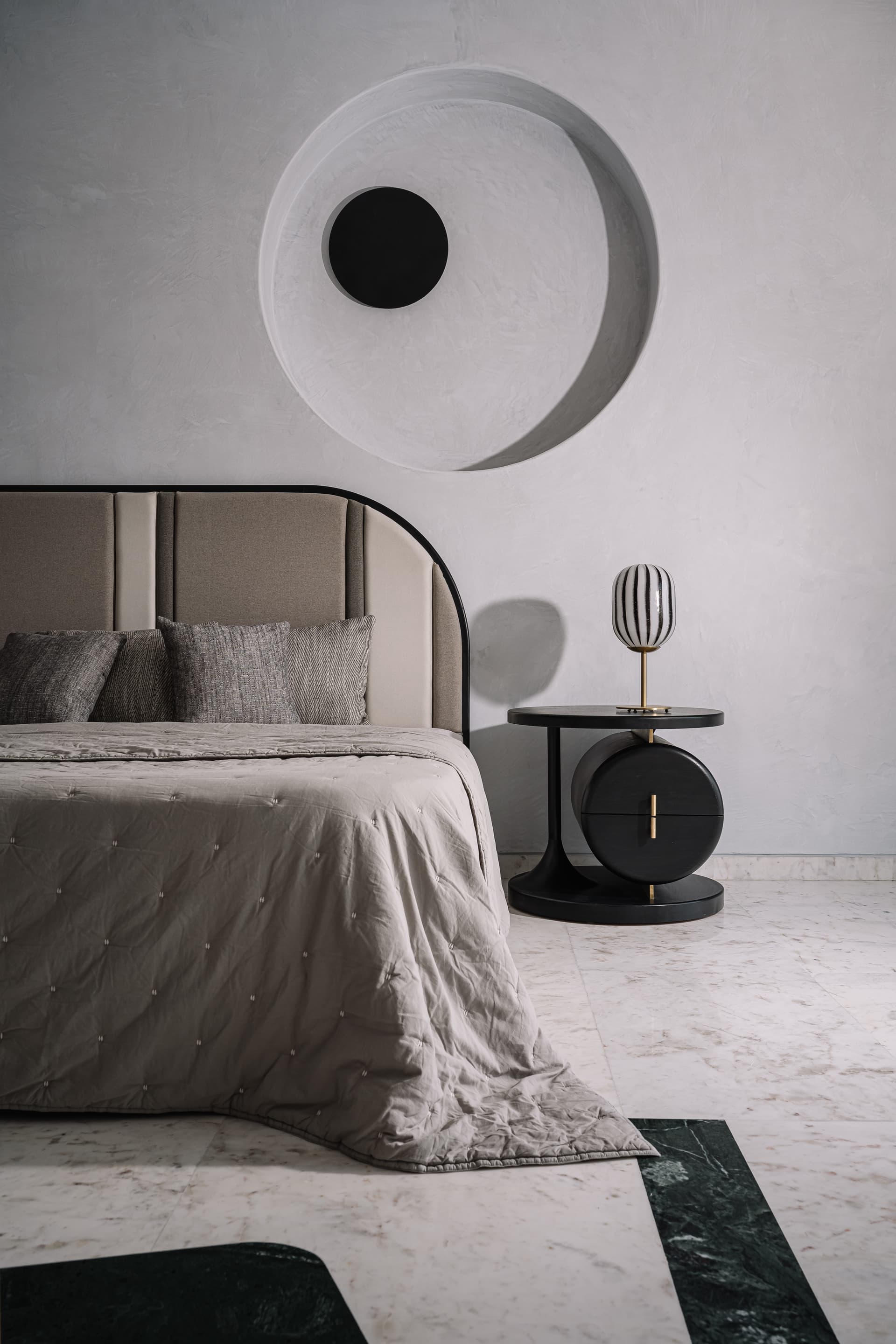 The third bedroom is definitely the finale of this trajectory of classic modernism. Bold and dynamic, to match the persona of the youngest member of the family it is scripted with convention-defying side tables, a sculptural light accent in the backdrop of grey textured walls and inlays of kesariyaji green marble on the floor.