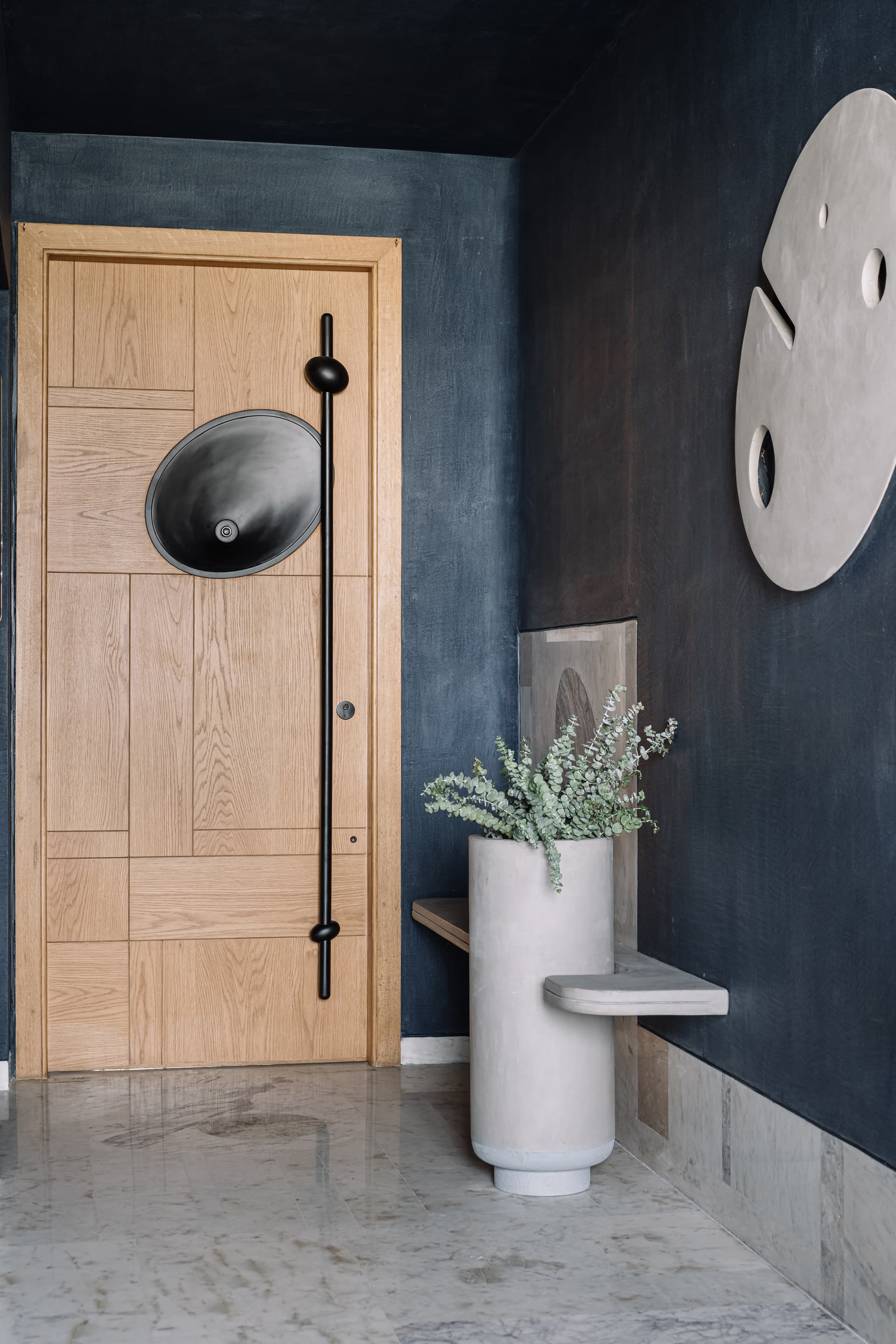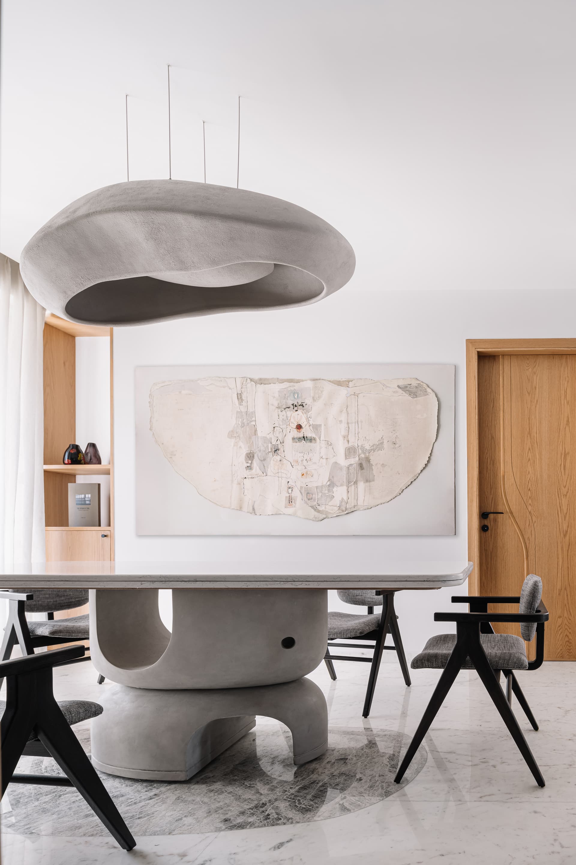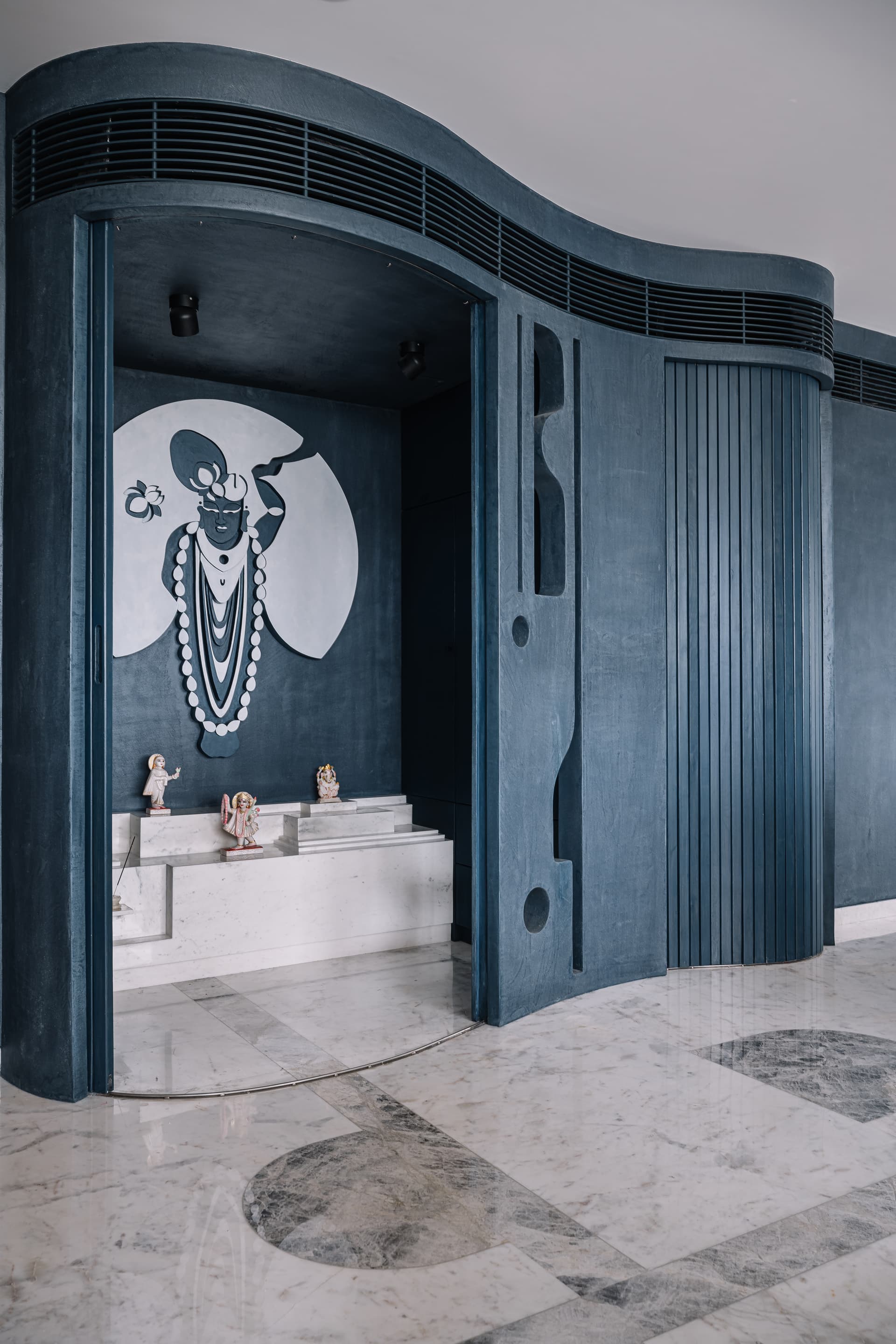A sublime abstract sculpture of Shrinathji blesses the family from its exalted stance in the traditional temple as it opens gently into the living room. Multiple marble steps inside inspired by Carlo Scarpa’s works are adorned with miniature idols in the backdrop of deep-blued walls. The allure of art deco prevails through the dining area where a fog-grey stone inlay in an abstract ellipsoid design embellishes the floor. The pattern is reflected by the pendulum dining light, pivoted with a dining table that is a sculptural delight and balanced perfectly with a captivating painting by artist Shahanshah Mittal on the adjacent wall. Adjoined by a spacious kitchen in verdant olive green it looks more like a family bonding area over cooking or comfort munching.