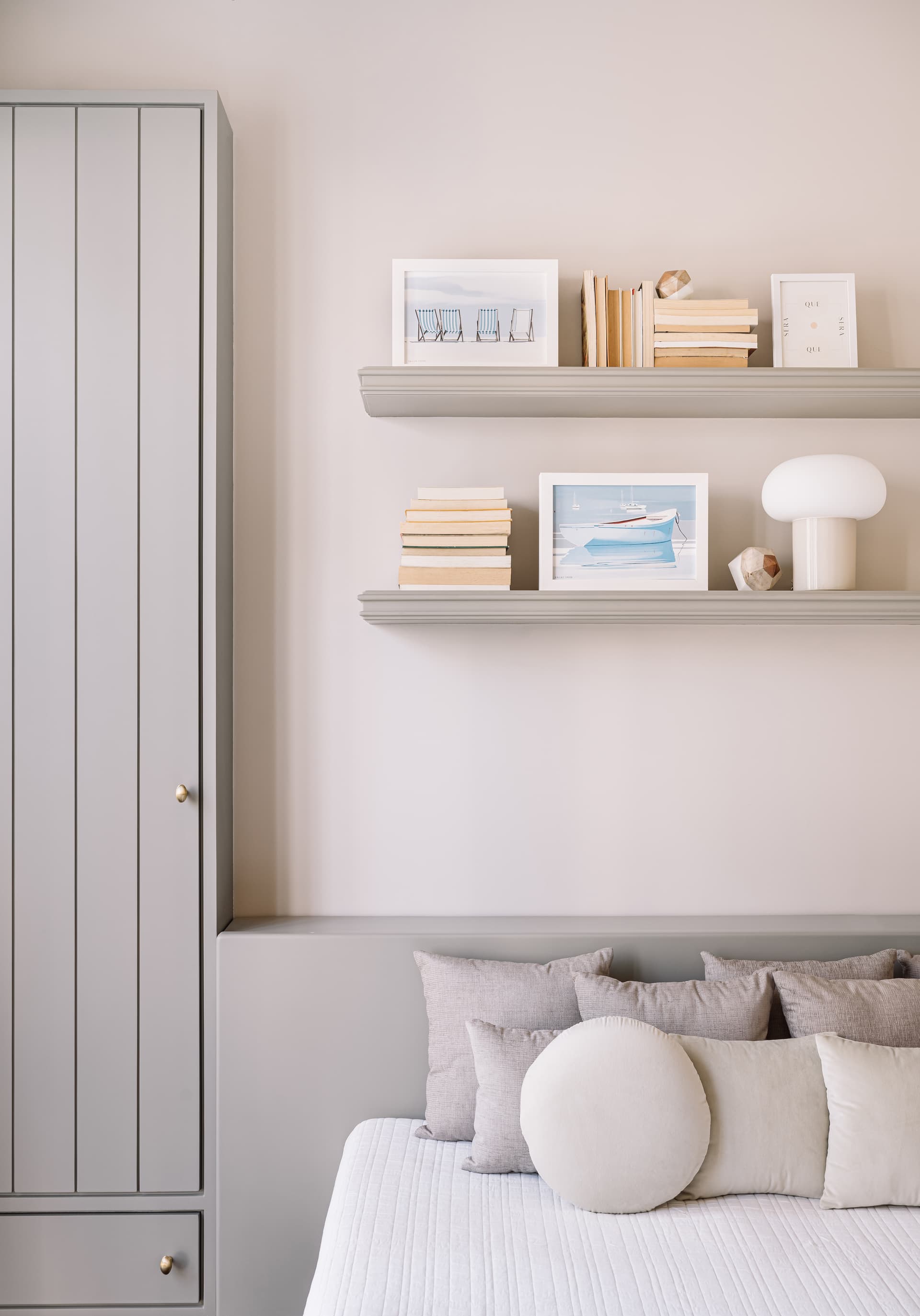 Bearing versatile DNA, the quaint guest bedroom is envisioned as an informal family den ruled by warm greys, beige, and whites. Reminiscent of roomy divan beds in older Indian residences from the yesteryears, the space houses a sizable daybed to unwind, rest or read. A pair of open shelves run overhead and display the client’s bevy of books, bric-a-brac, and art that can be refreshed occasionally.