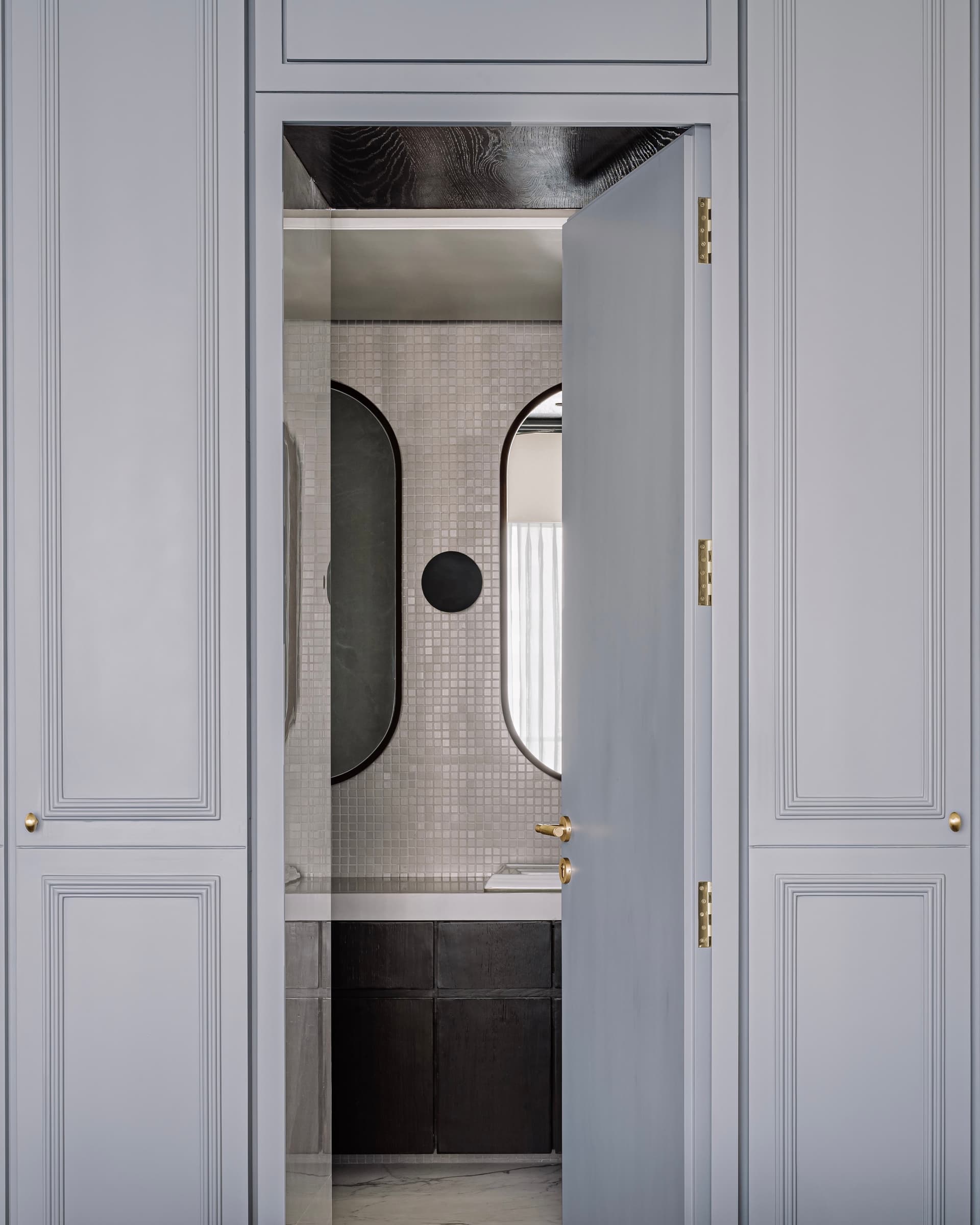 The panelled wardrobes are rendered in a powder blue-grey hue with brass hardware and border one edge of the bedroom. The wardrobe wall hosts a central shutter which leads into the ensuite bathroom and melds to become a cohesive part of the elevation. Relishing a tonal play, the glimpses of the bathroom reveal the amalgamation of Piccolo dove-grey-hued mosaic tiles, marble, and deep-stained wood that distil a plush experience.