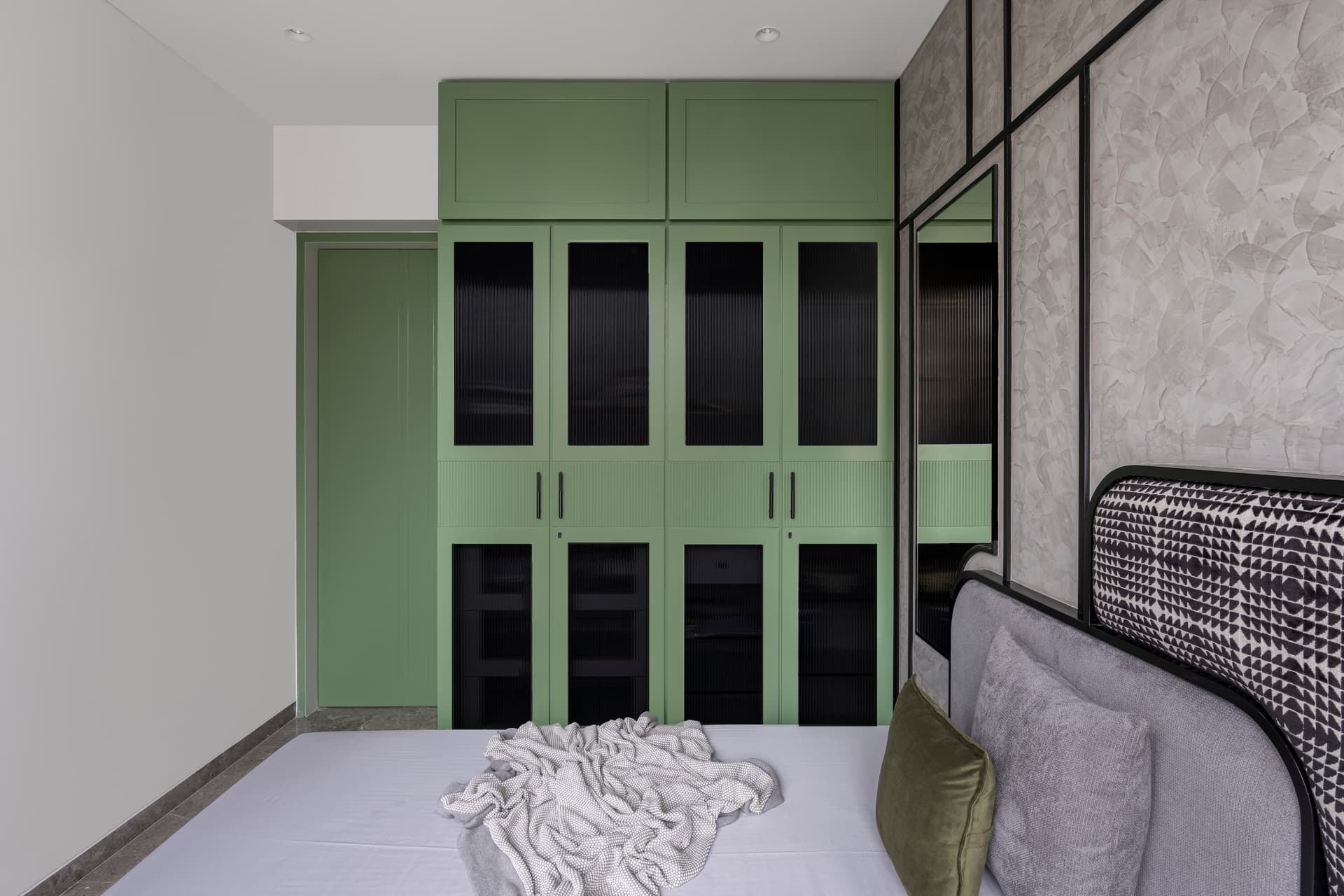 The home is a vivid play of color and contrast, with deep emerald greens, luxurious velvets, intricate marble inlays, and sculptural lighting. “It was important that it didn’t feel overbearing despite the boldness,” she says. “So, we anchored it with a strong visual rhythm—repeating forms, controlled color palettes, and consistent lighting tones.”